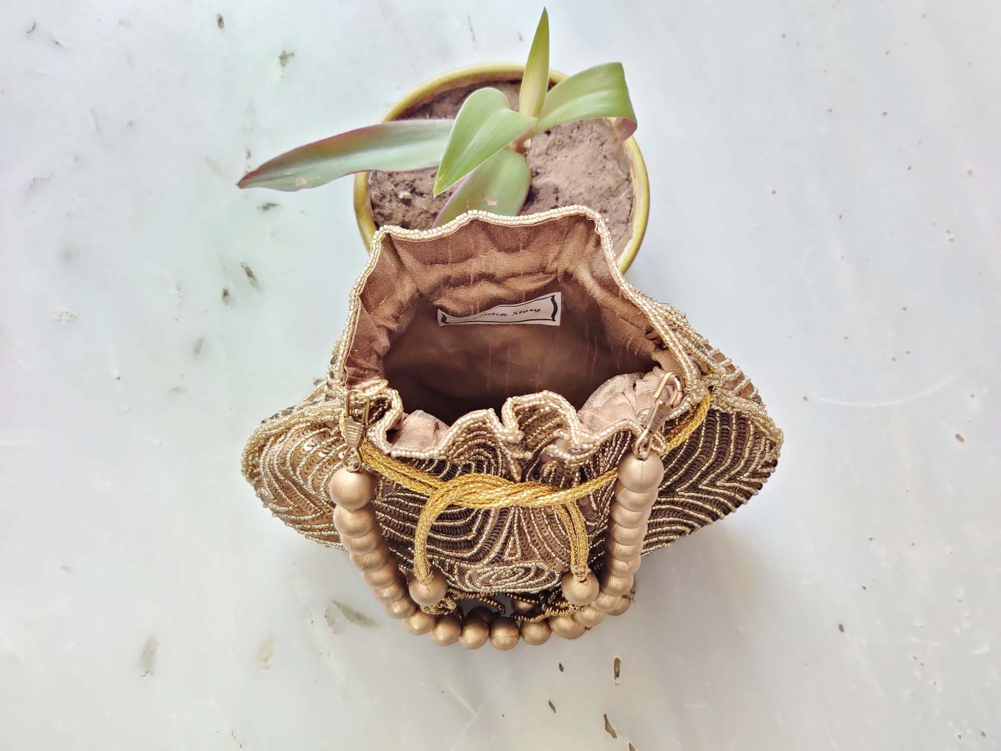 Potli hand embroidered with Antique Gold sequins in circular pattern on both sides. The Potli comes with beautiful handmade Gold Latkans and handmade Gold beaded handle.