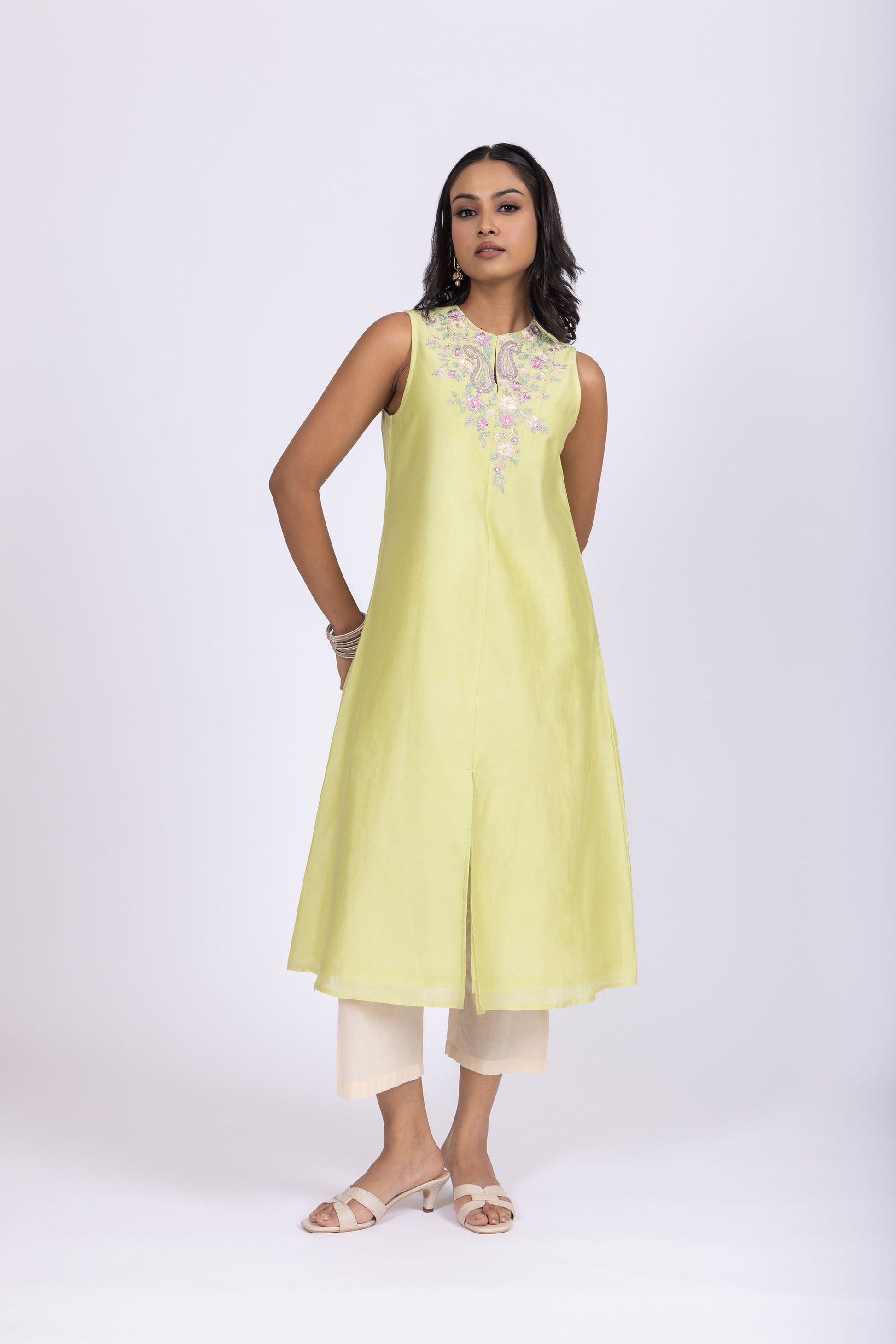 Mint Green Chanderi A-Line Kurta with Sequin and Pearl Embroidery Sleeveless mint green Chanderi kurta with embroidered neckline featuring water sequins and pearl work. Paired with beige straight cotton pants.Product Type: Kurta Set Style Type: A-Line Kurta with Straight Pants Pattern: Embroidered Length: Below Knee Closure: Back Closure Lining: Fully Lined
