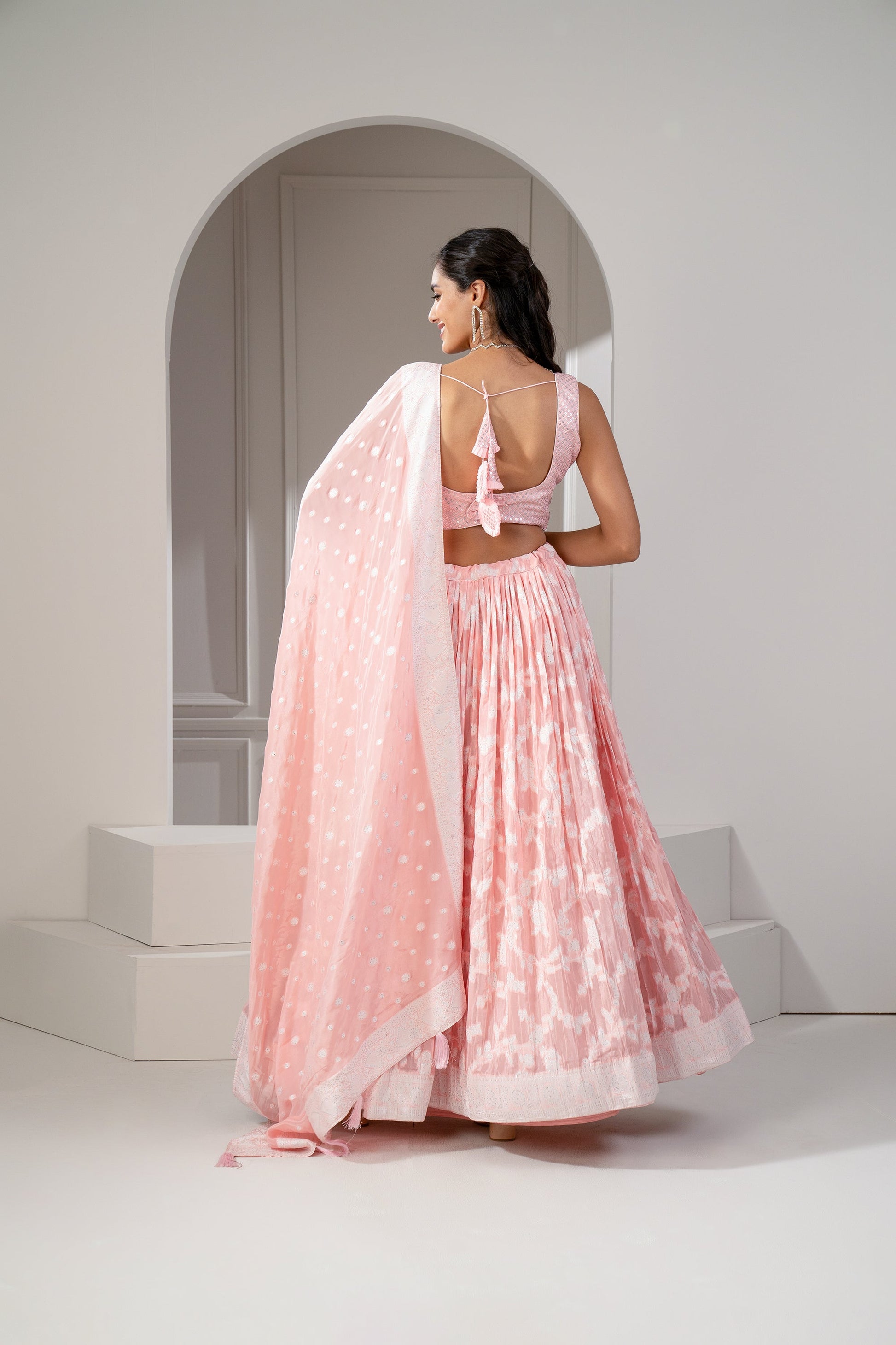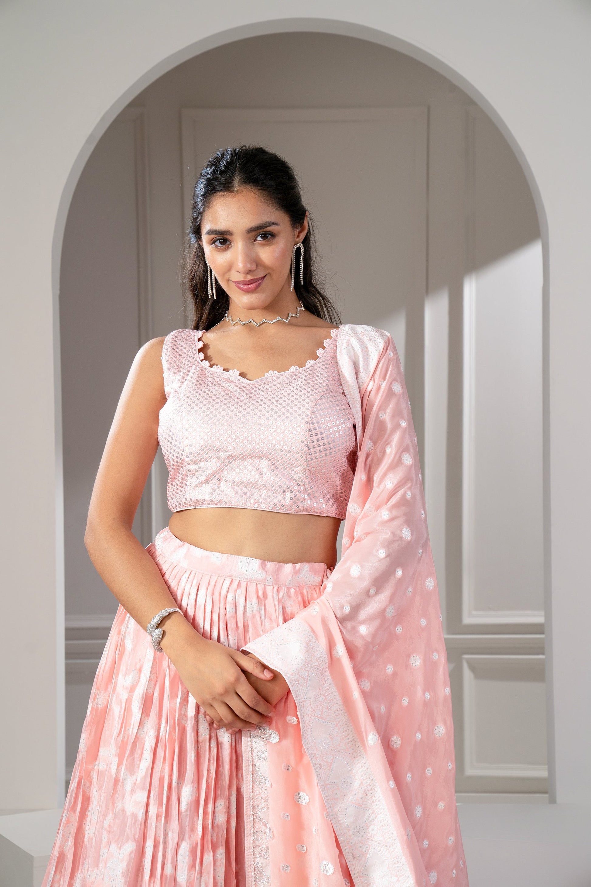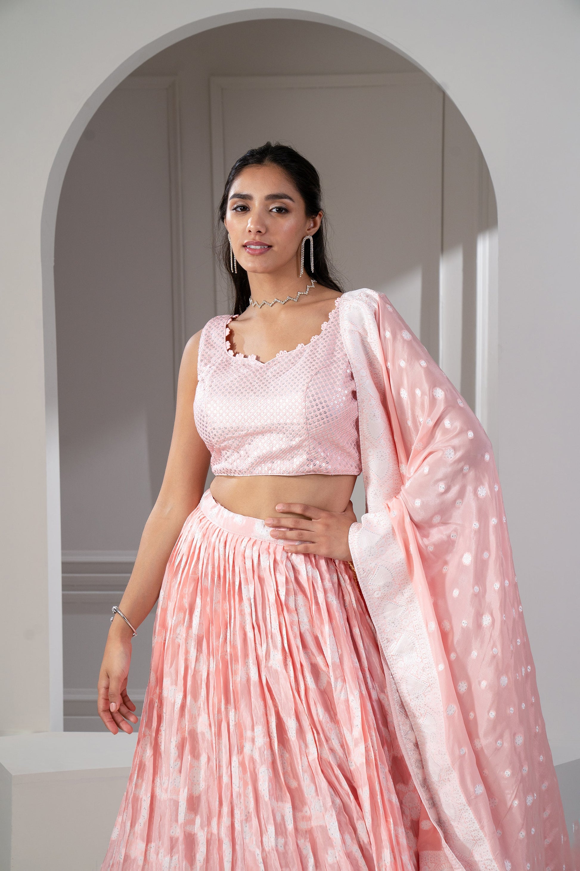 Apricot peach soft silk printed lehenga. 2) Topped with a matching dupatta with sequins and thread work. 3) Paired with a matching sleeveless padded sequinned choli.