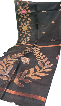 Authentic Soft Silk Muslin Jamdani Saree in Jet Black, Copper and Multicolored Meenakari Work