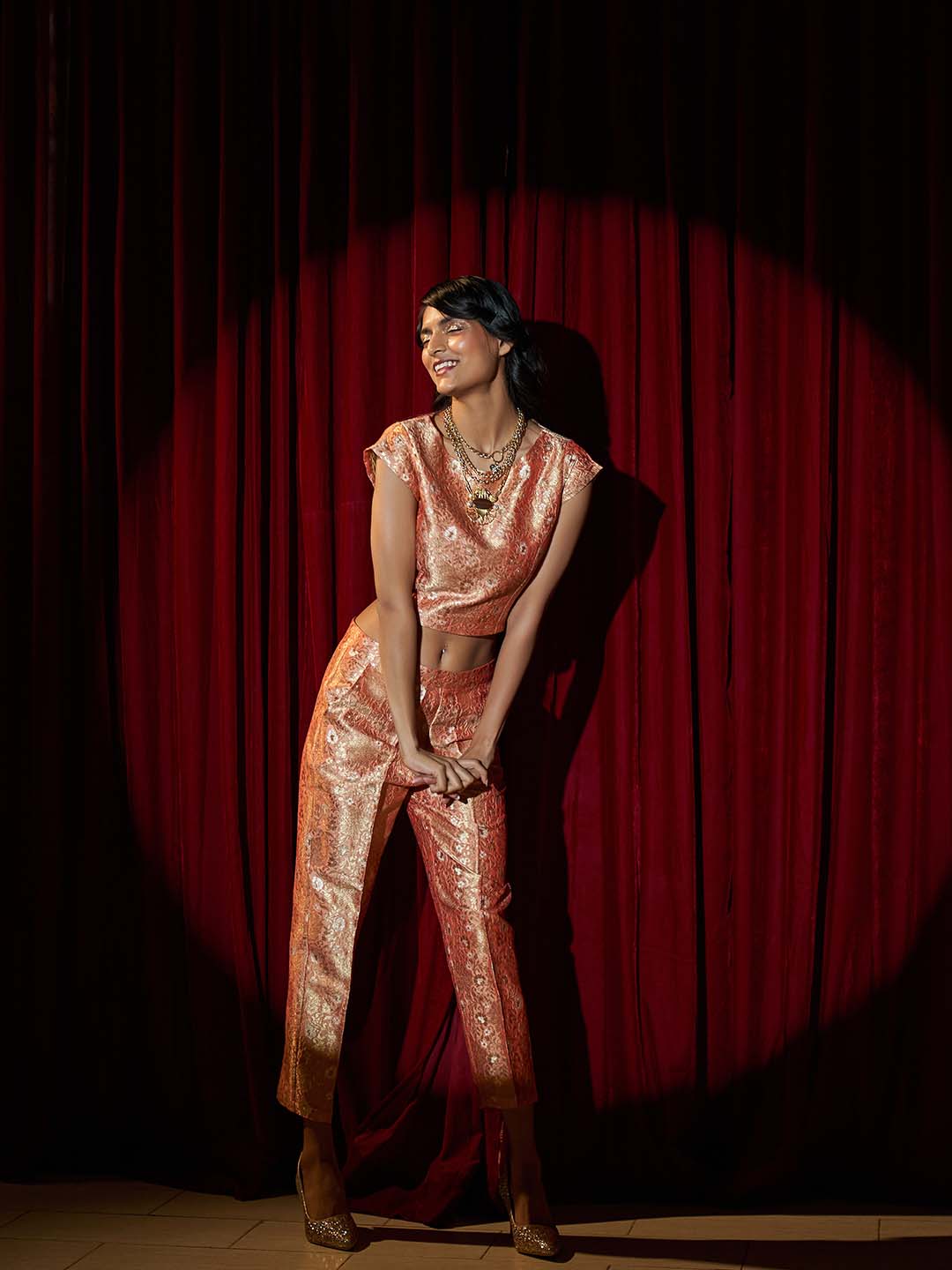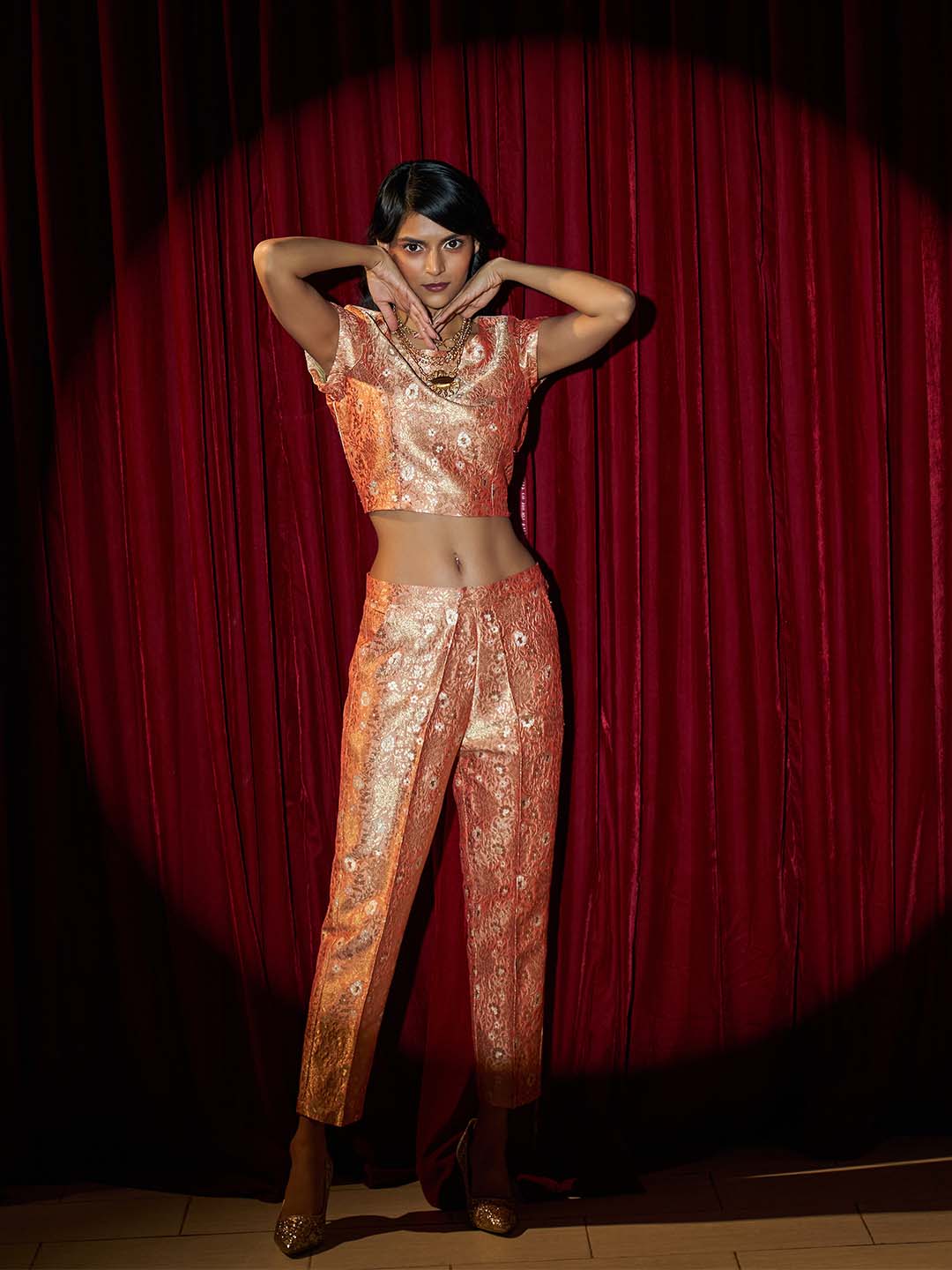 Marigold Banarasi Brocade Crop Top Co Ord Set Short Sleeves