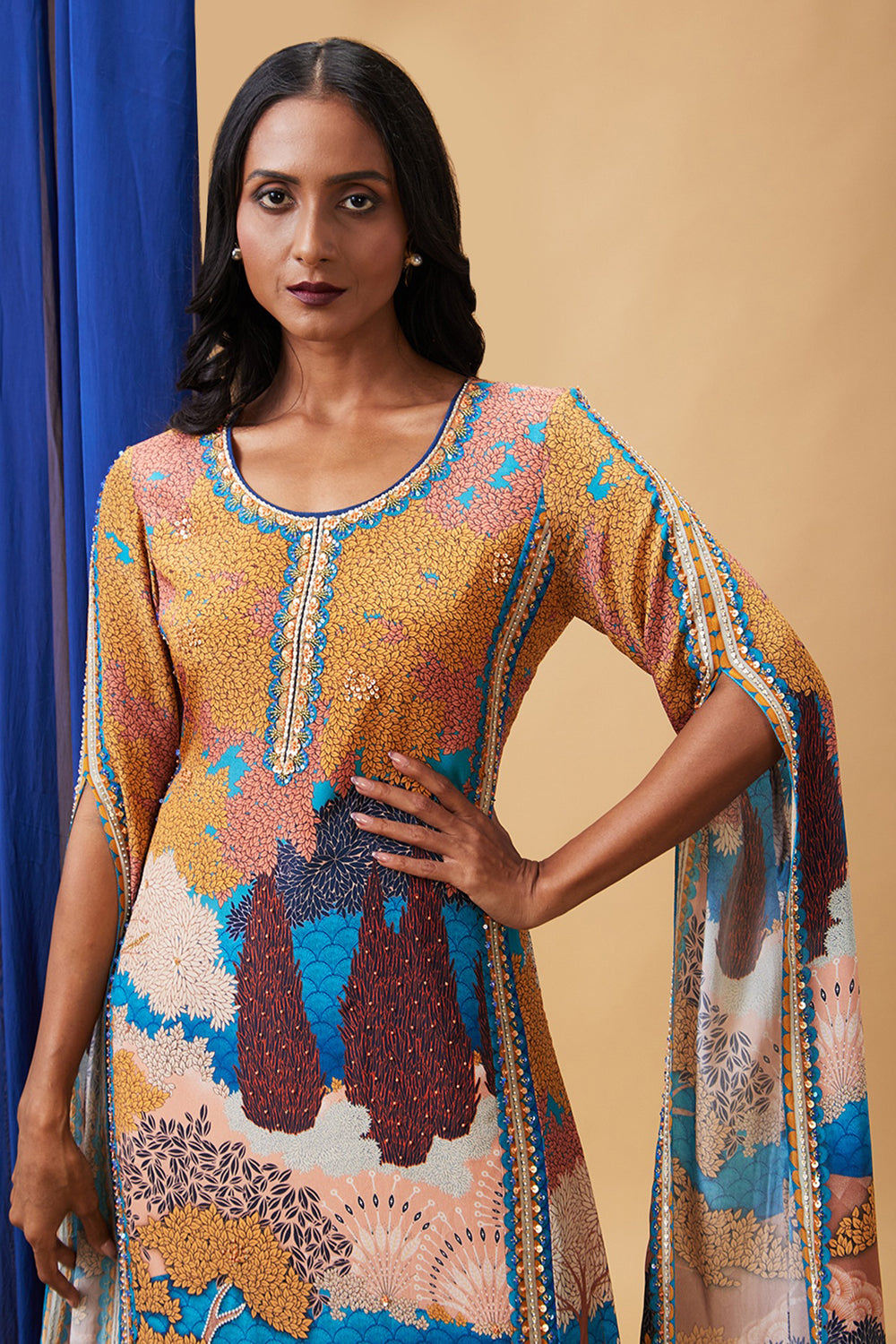 Beige Benazir Embroidered Kurta With Long Sleeves Paired With Flared Pants In Crepe.