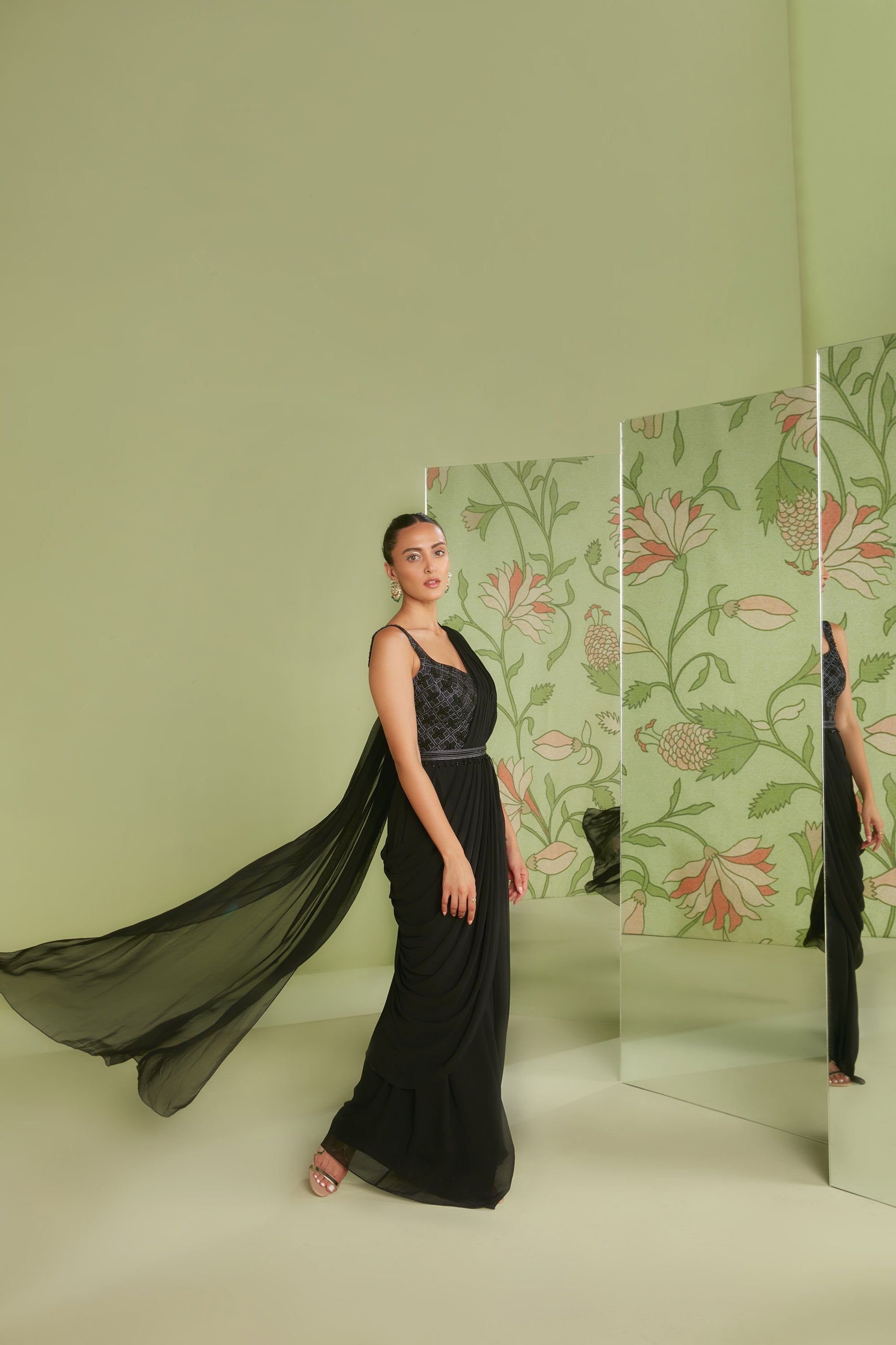Black Georgette 3D Geometrical Embroidery Jumpsuit Saree