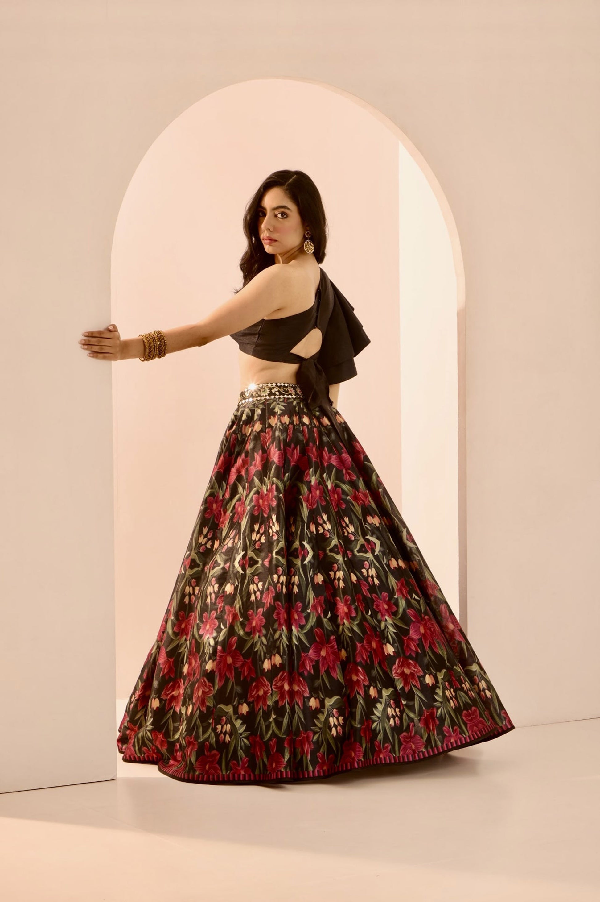 Floral Printed Black Silk Lehenga with Silk One Shoulder Ruffled Tie Back Blouse
