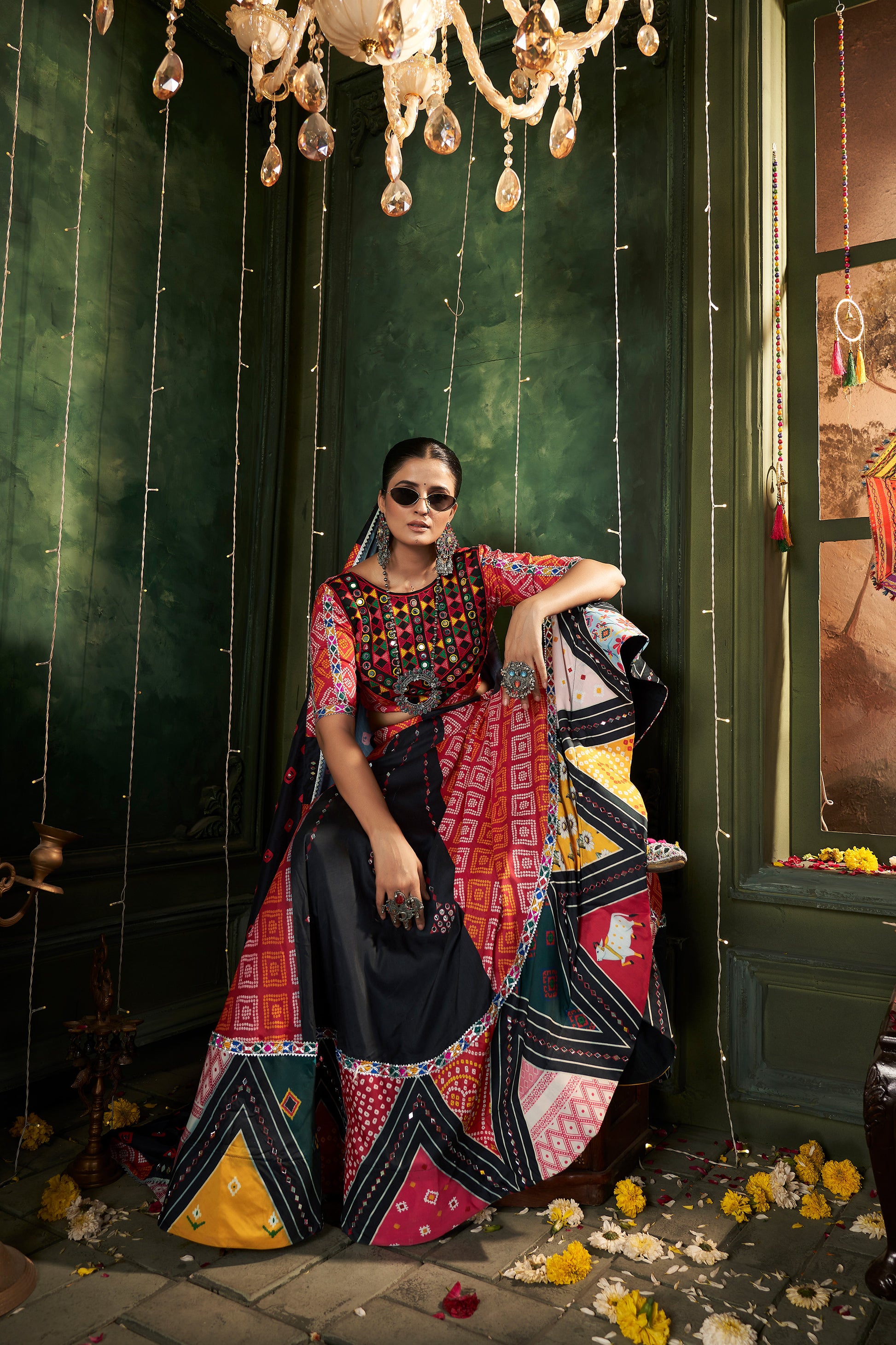 Black Muslin Cotton Mirror work Navratri Lehenga