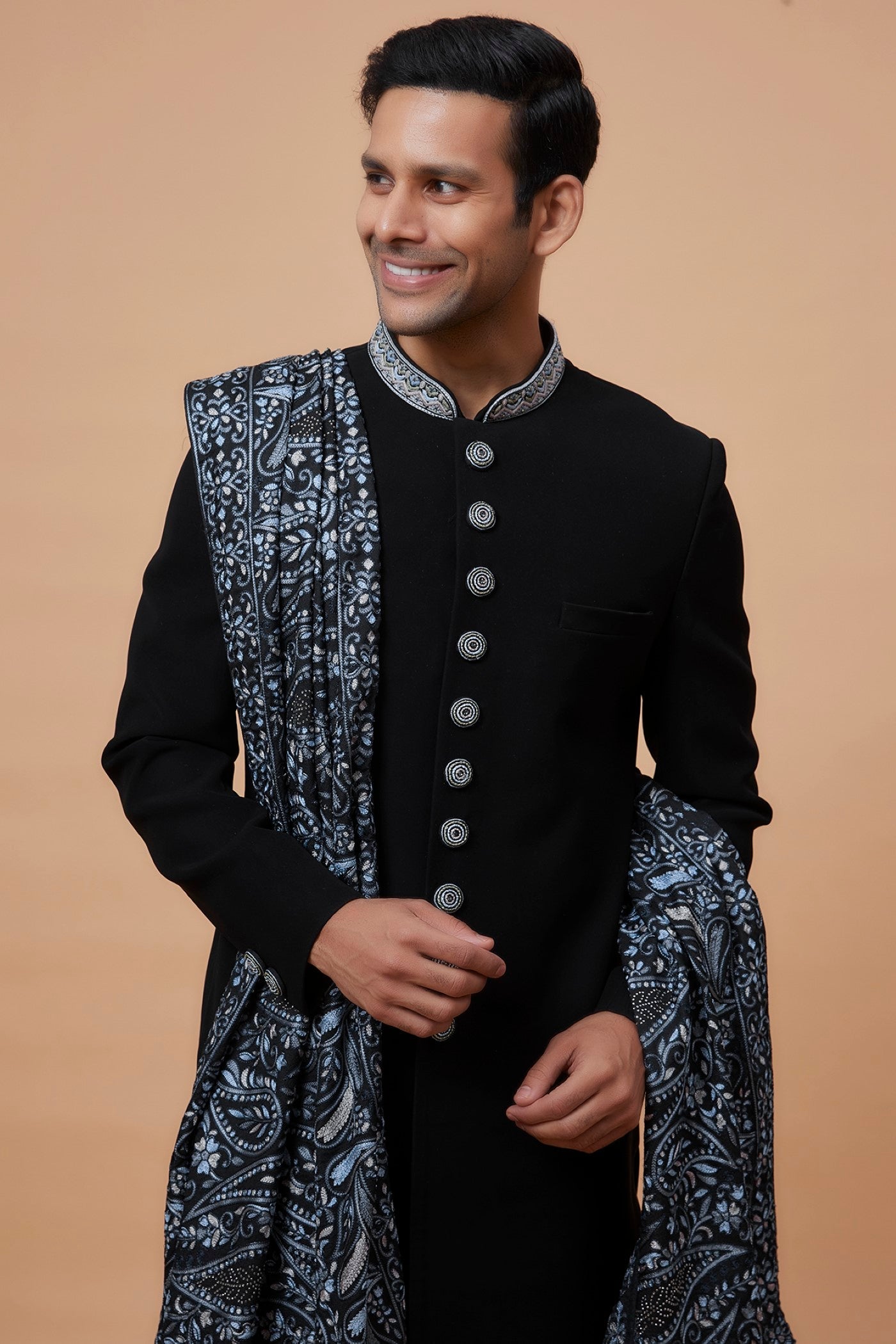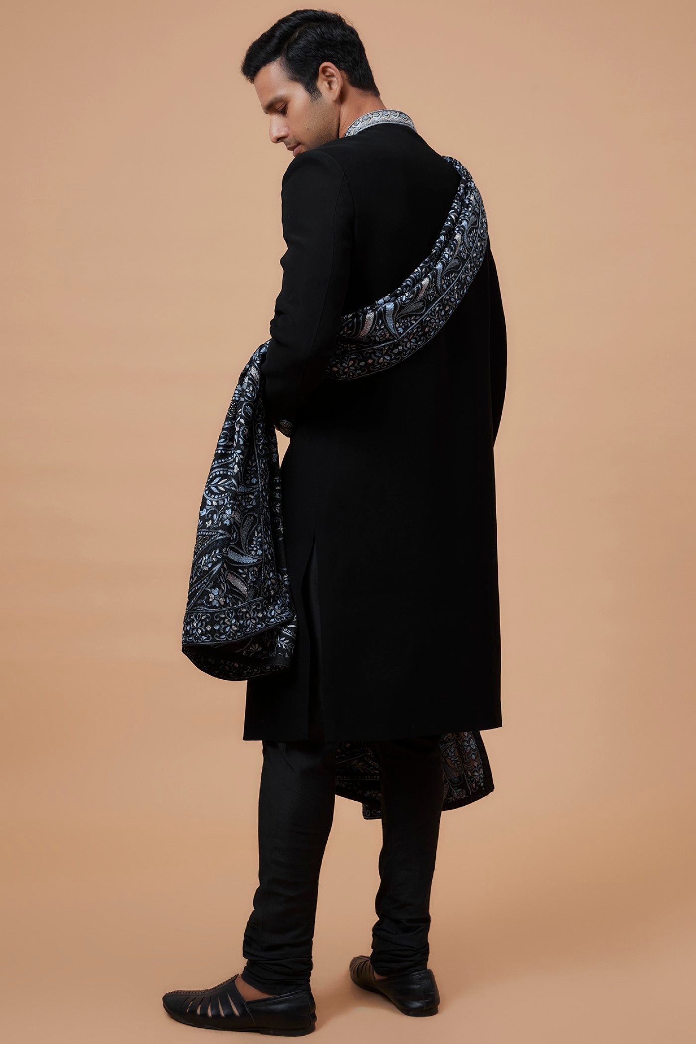 Featuring a black indowestern jacket in imported suiting fabric base with silk thread hand work. It is paired with matching silk churidar pants and a lucknowi dupatta.