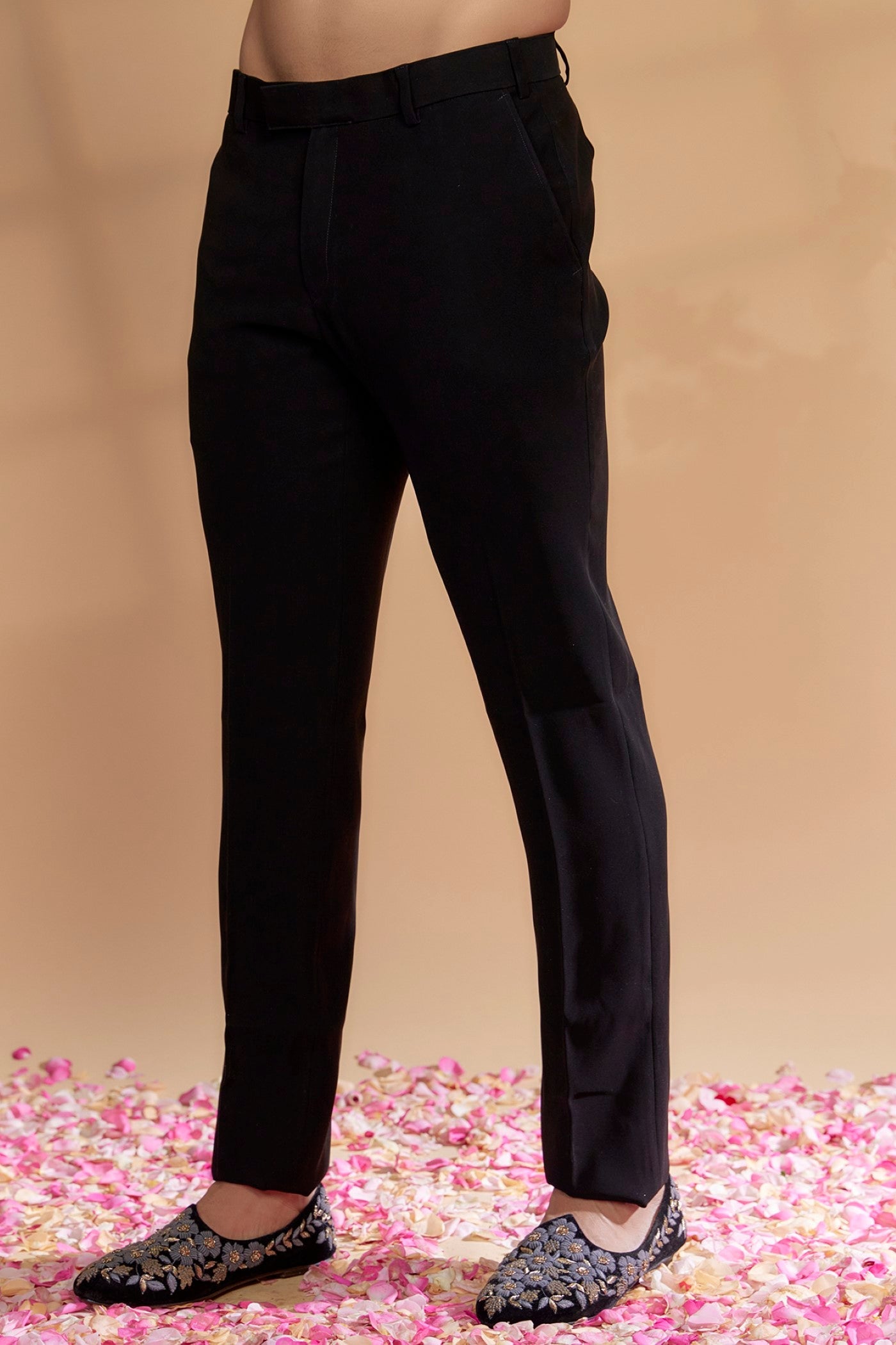 Featuring a black sherwani in velvet base with thread embellishments. It is paired with black pants. Perfect wear for a sangeet or reception ceremony.