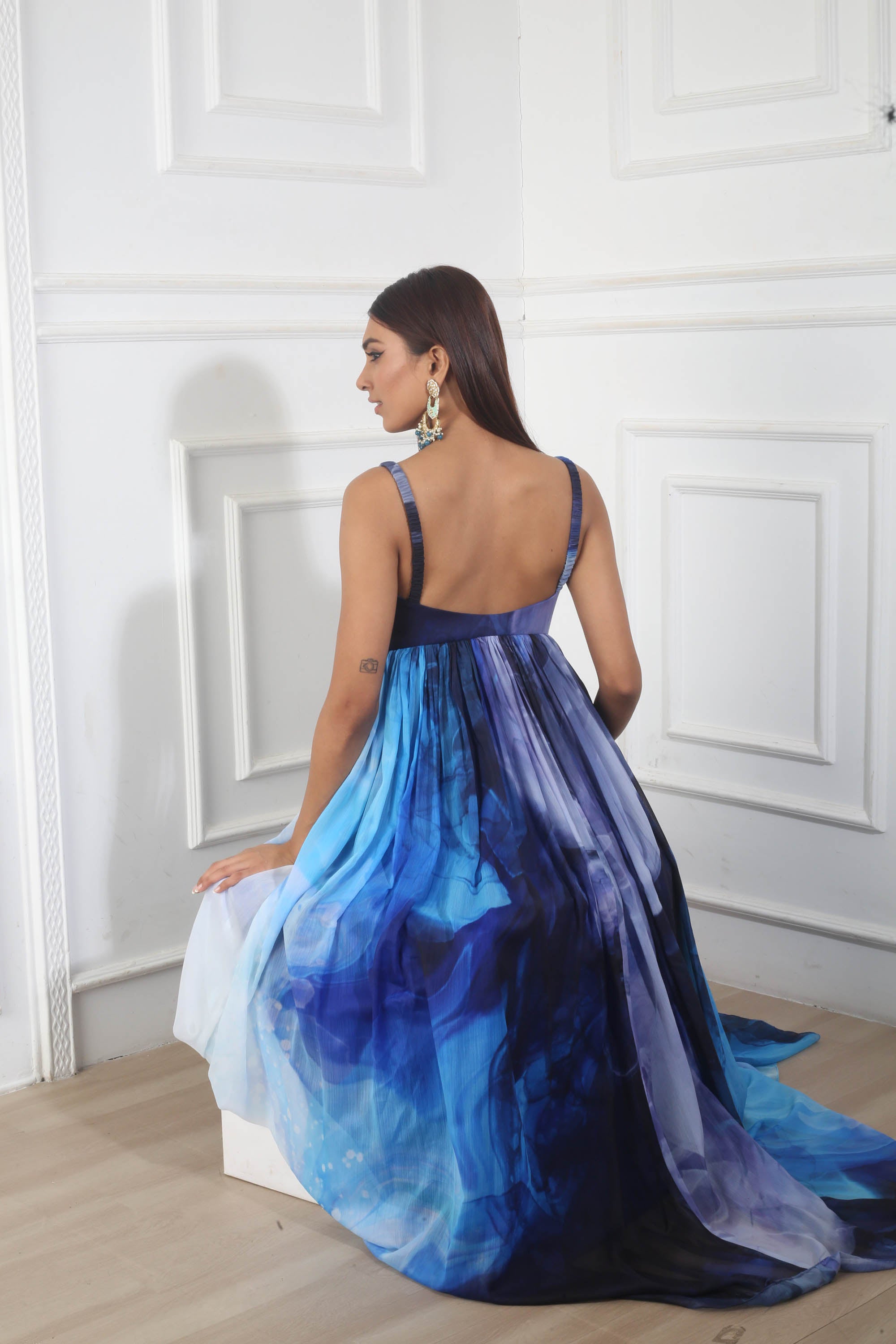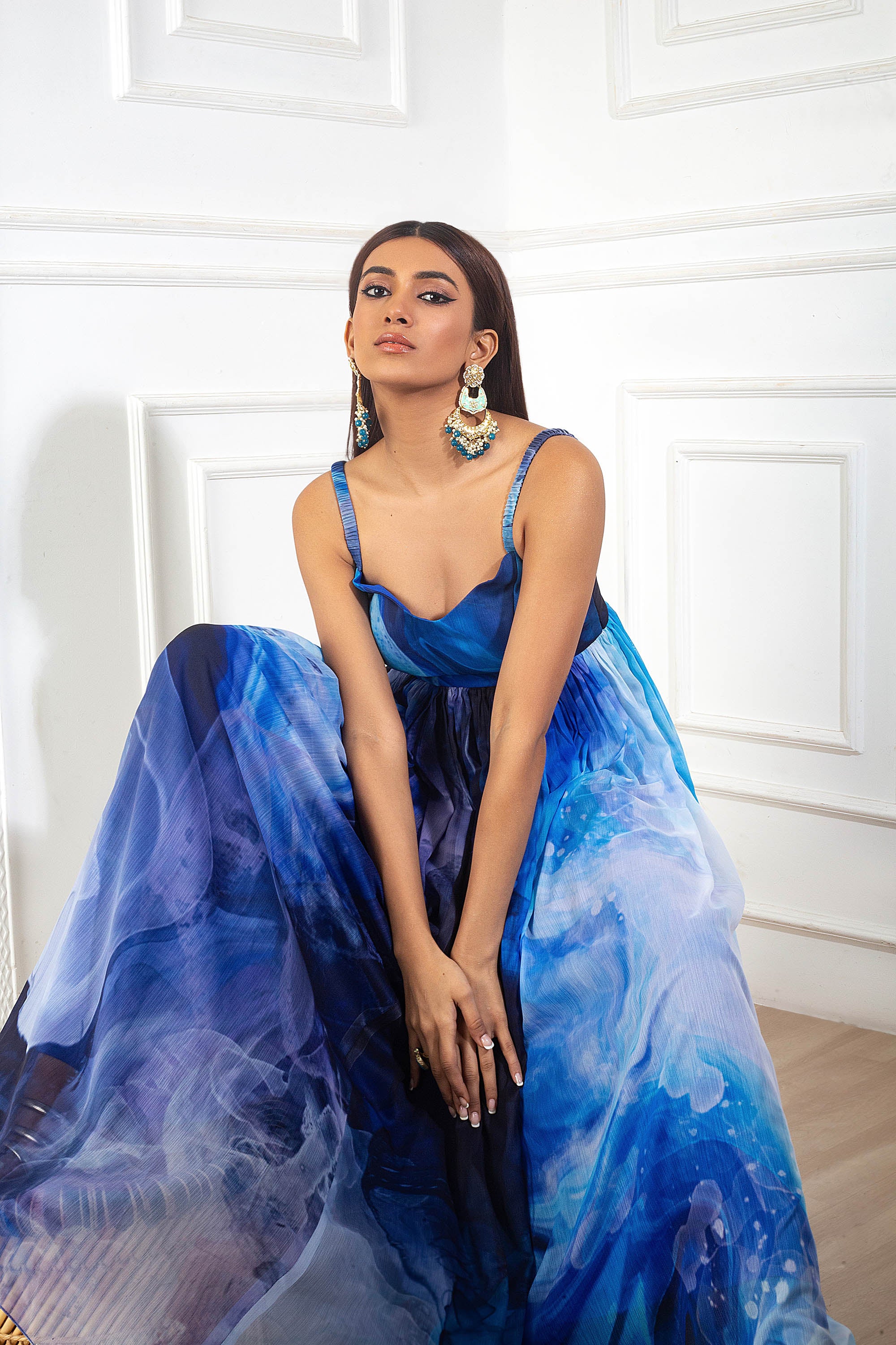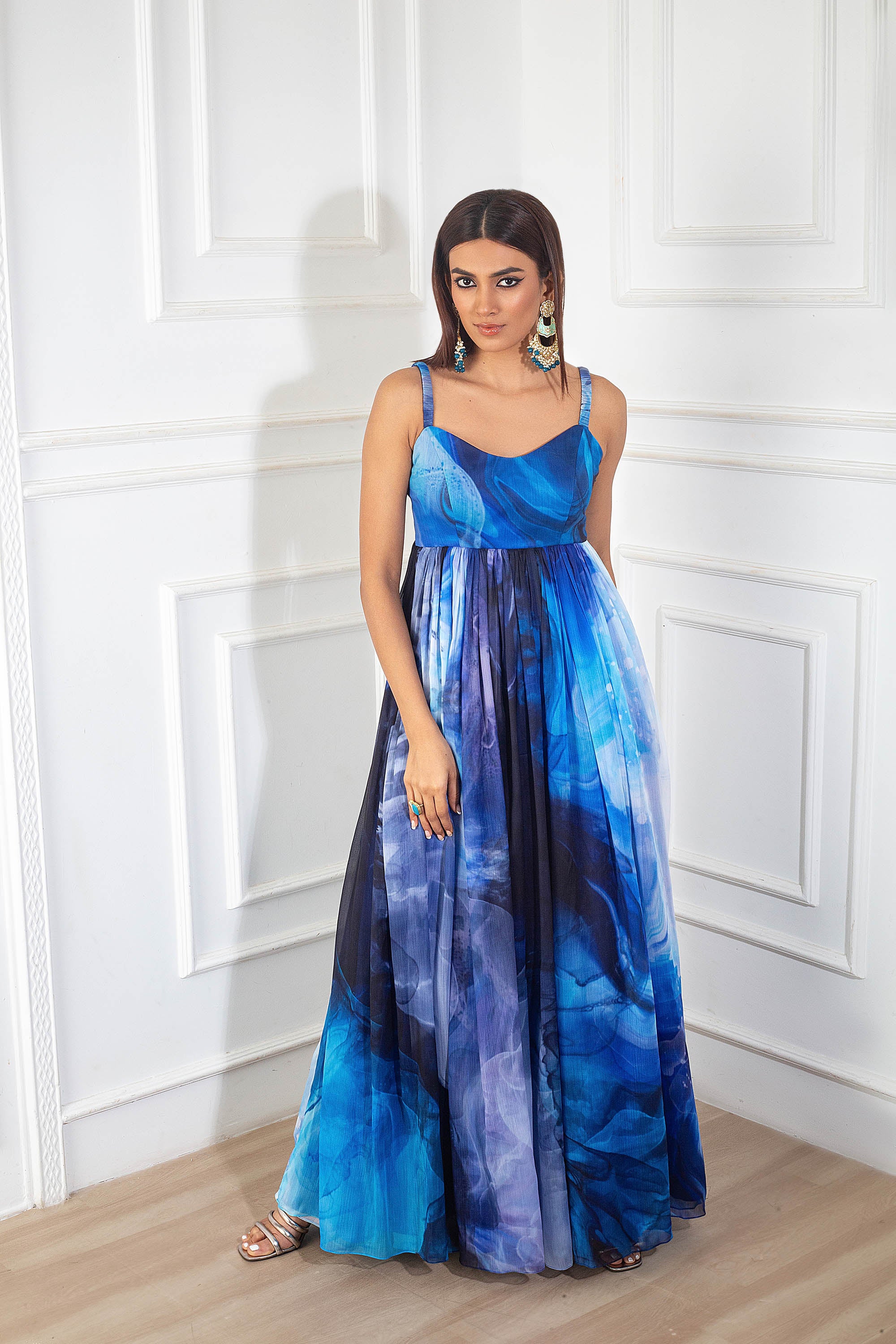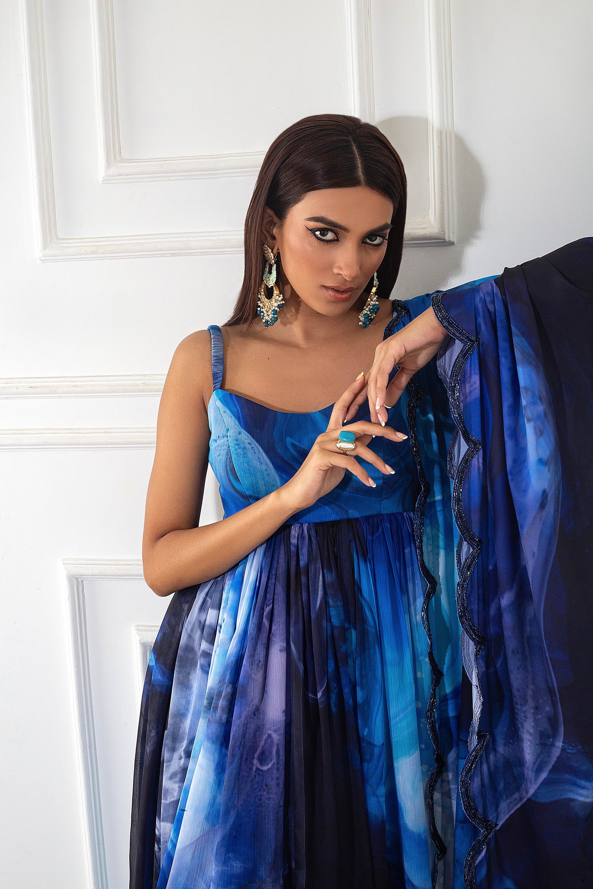 Blue printed strappy anarkali with matching printed palazzo pant and embroidered scallop dupatta.