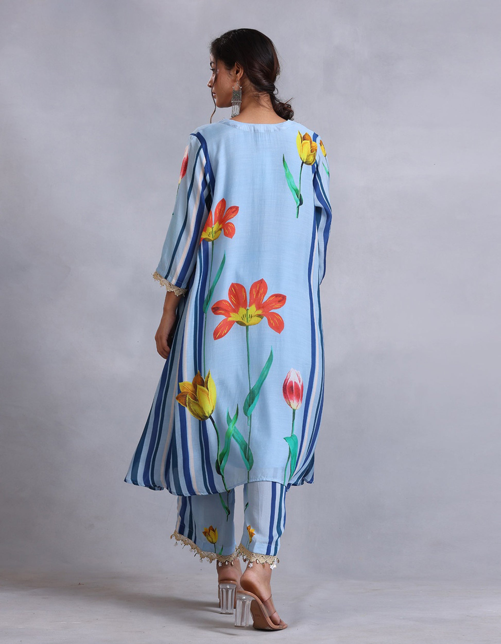 Blue princess cut kurta set with sequins and edging detail. It is paired with straight pant.