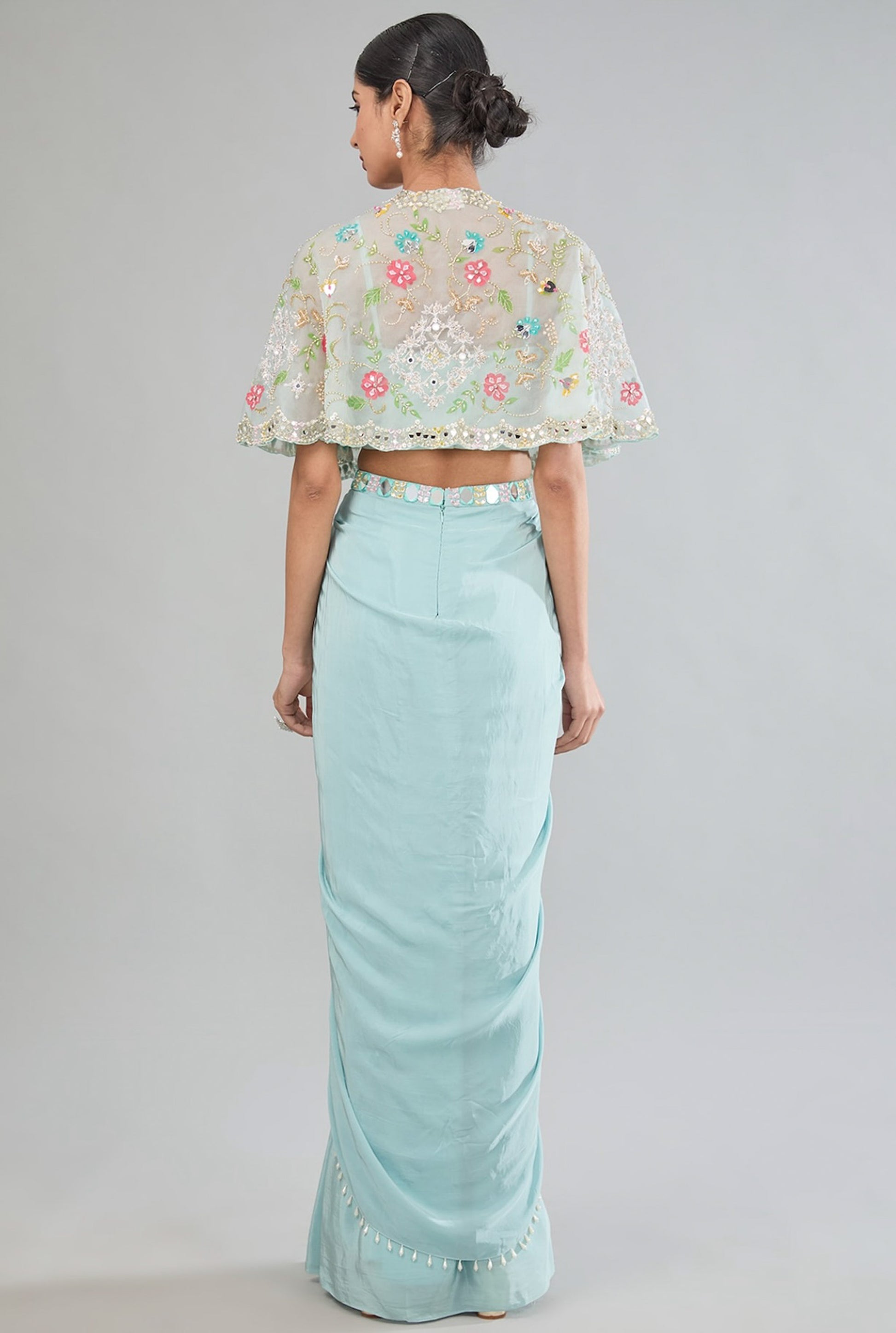 Blue Hand Embroidered Drape skirt with bustier and cape