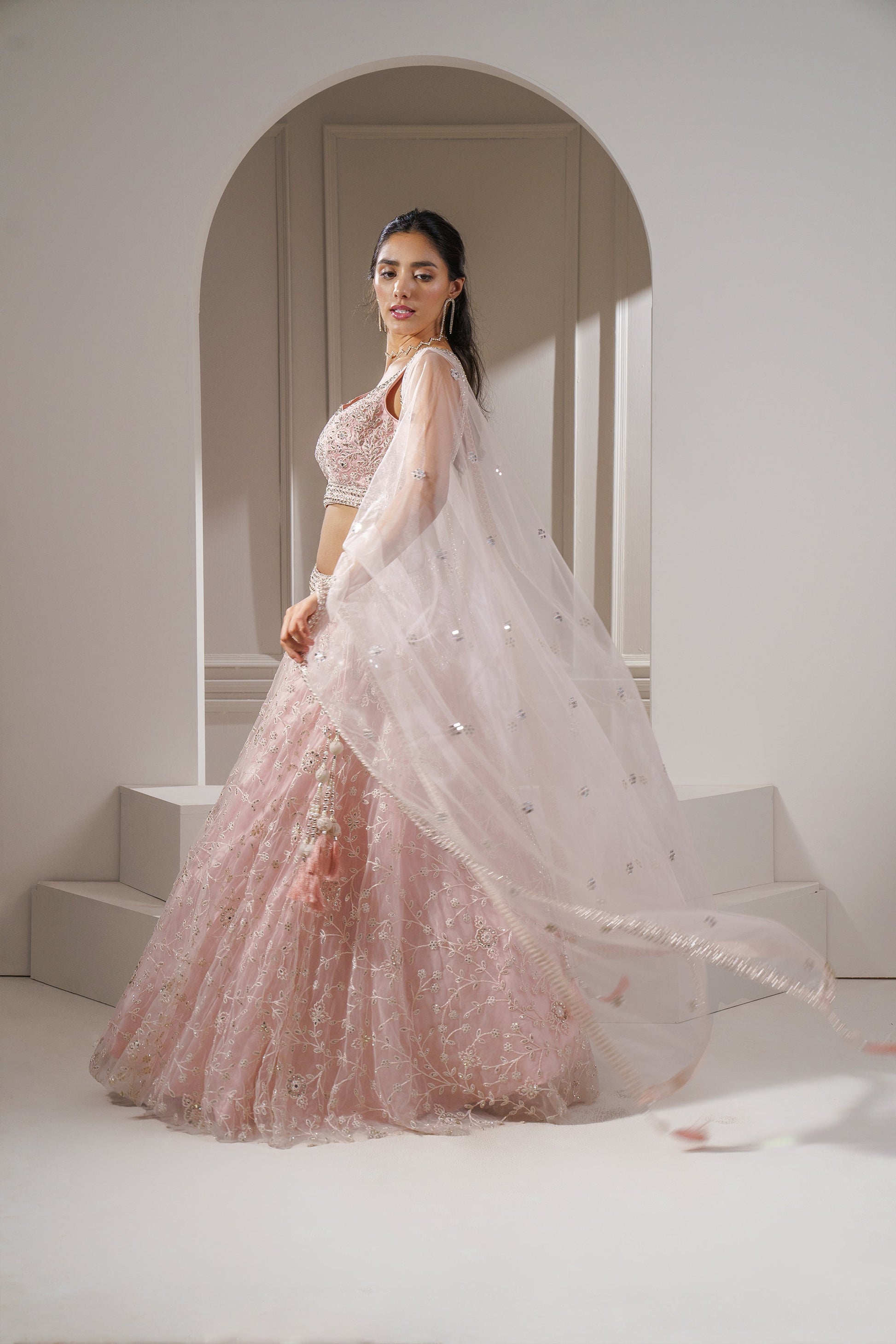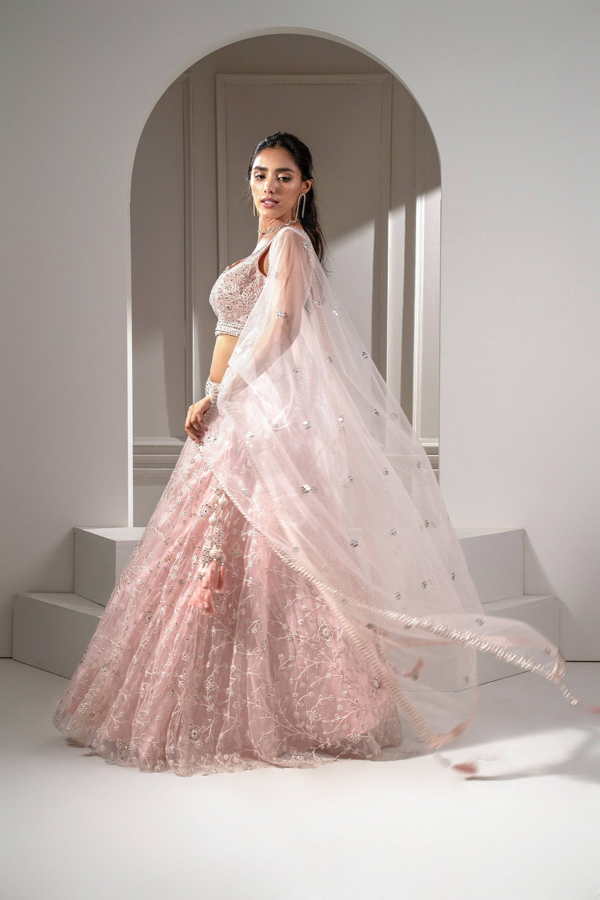 Blush Peach Organza Net Lehenga Set with Mirror, Thread and Sequins Embellishments,