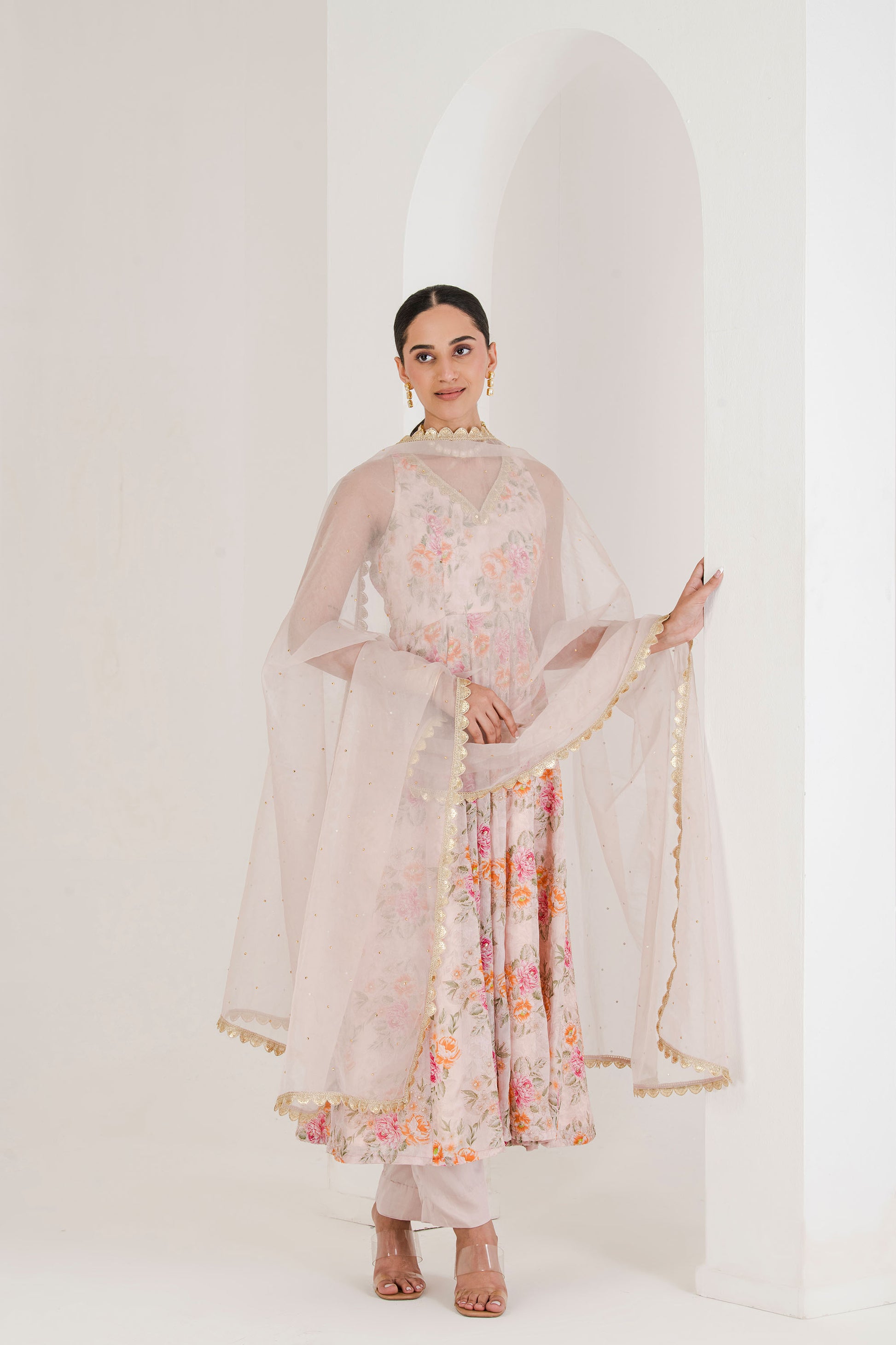 Blush Pink Floral Print Anarkali (set of 3 )
