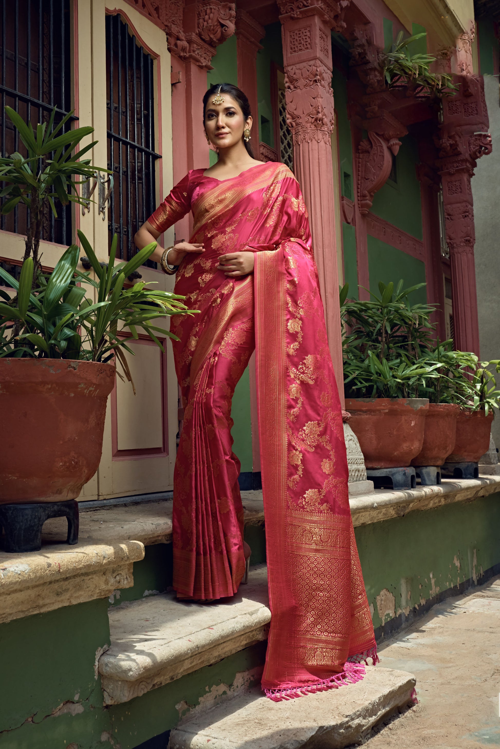 Bright Pink Golden Zari Banarasi Satin Silk Saree