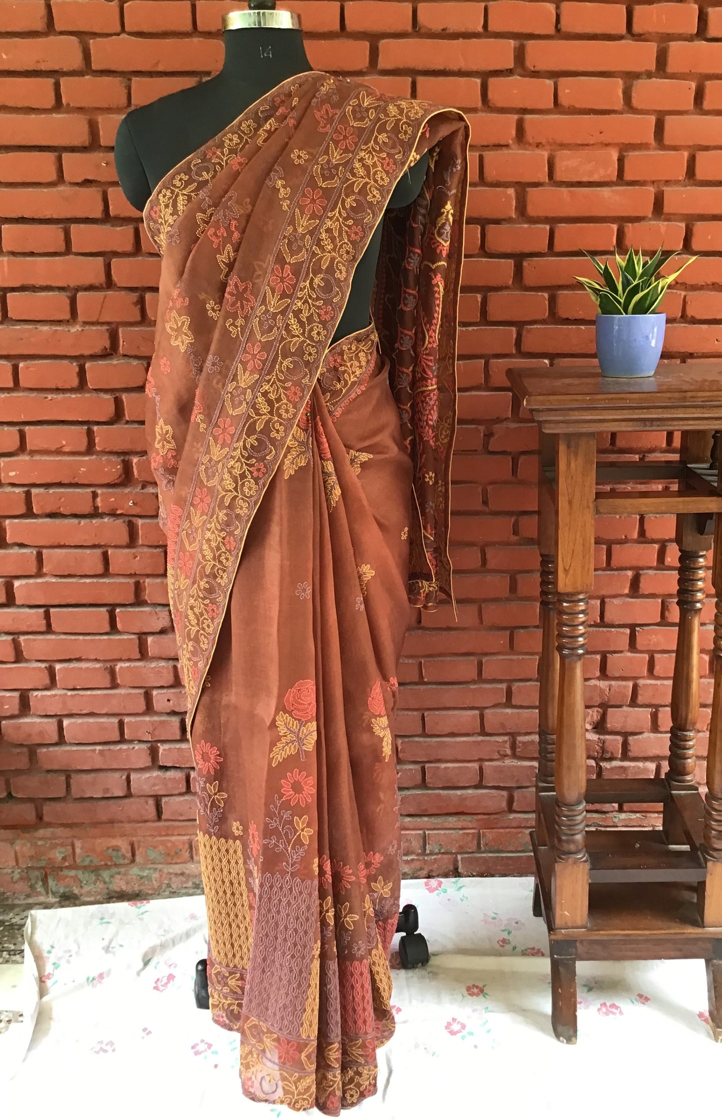 Brown Pure Silk Organza Bakhiya Pure Chikankari Saree