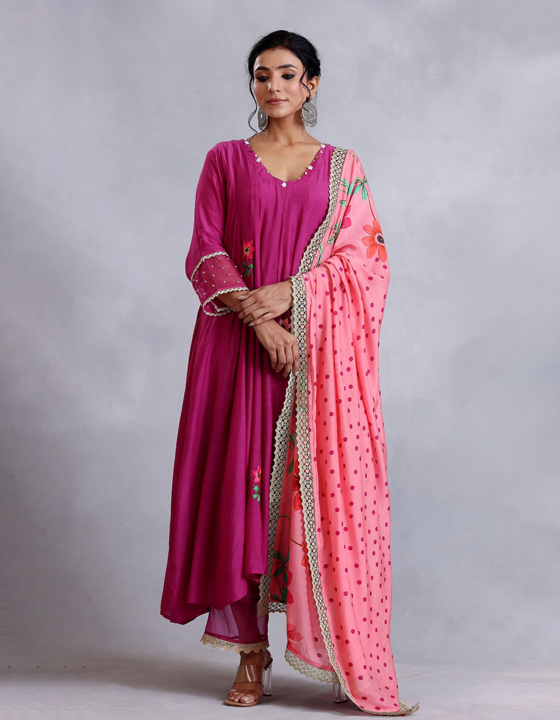 Burgandy embroidered kalidar kurta with sequins and golden edging detail. It comes with a matching straight pant and peach printed dupatta.