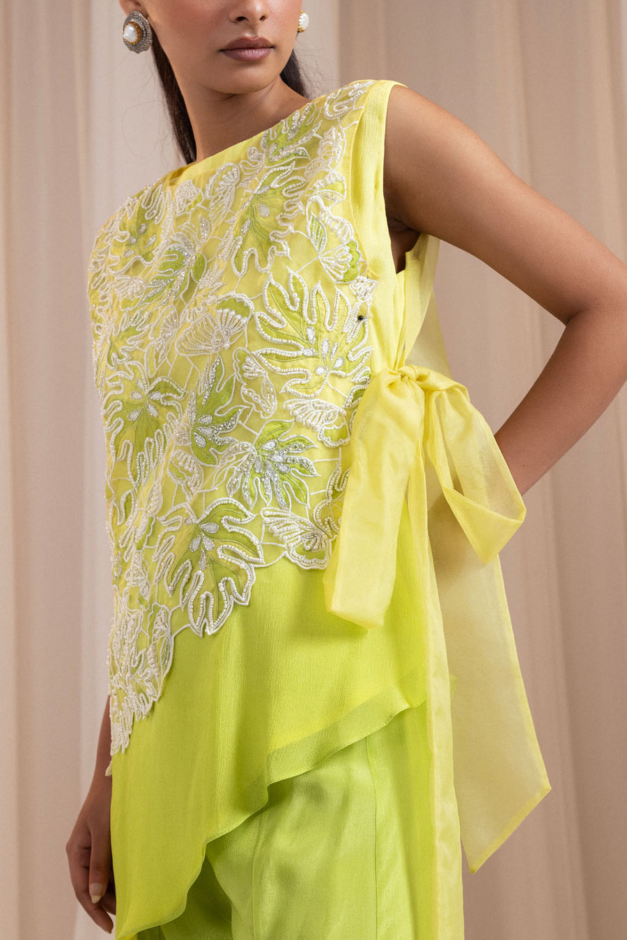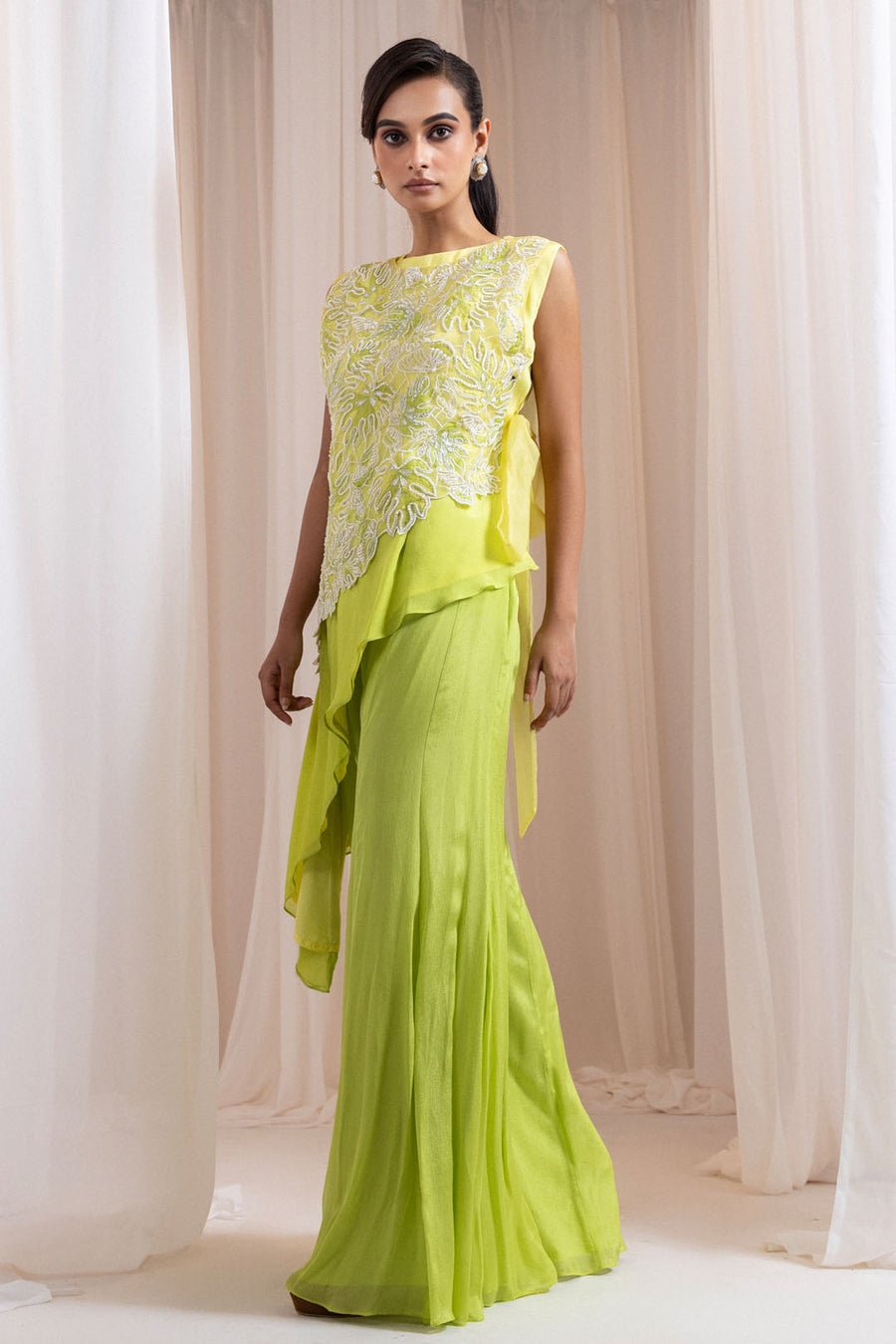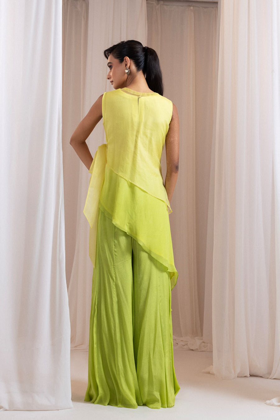 A vibrant lime-yellow three-piece set featuring an ombré tie-dye high-neck asymmetrical top. It’s layered with a one-sided sheer organza overlay jacket, embroidered with delicate leafy motifs in cutdana, beads, and thread. Paired with wide flared pants, the silhouette is fresh, fluid, and festive. Ideal for mehendi functions, daytime weddings, and summer celebrations.