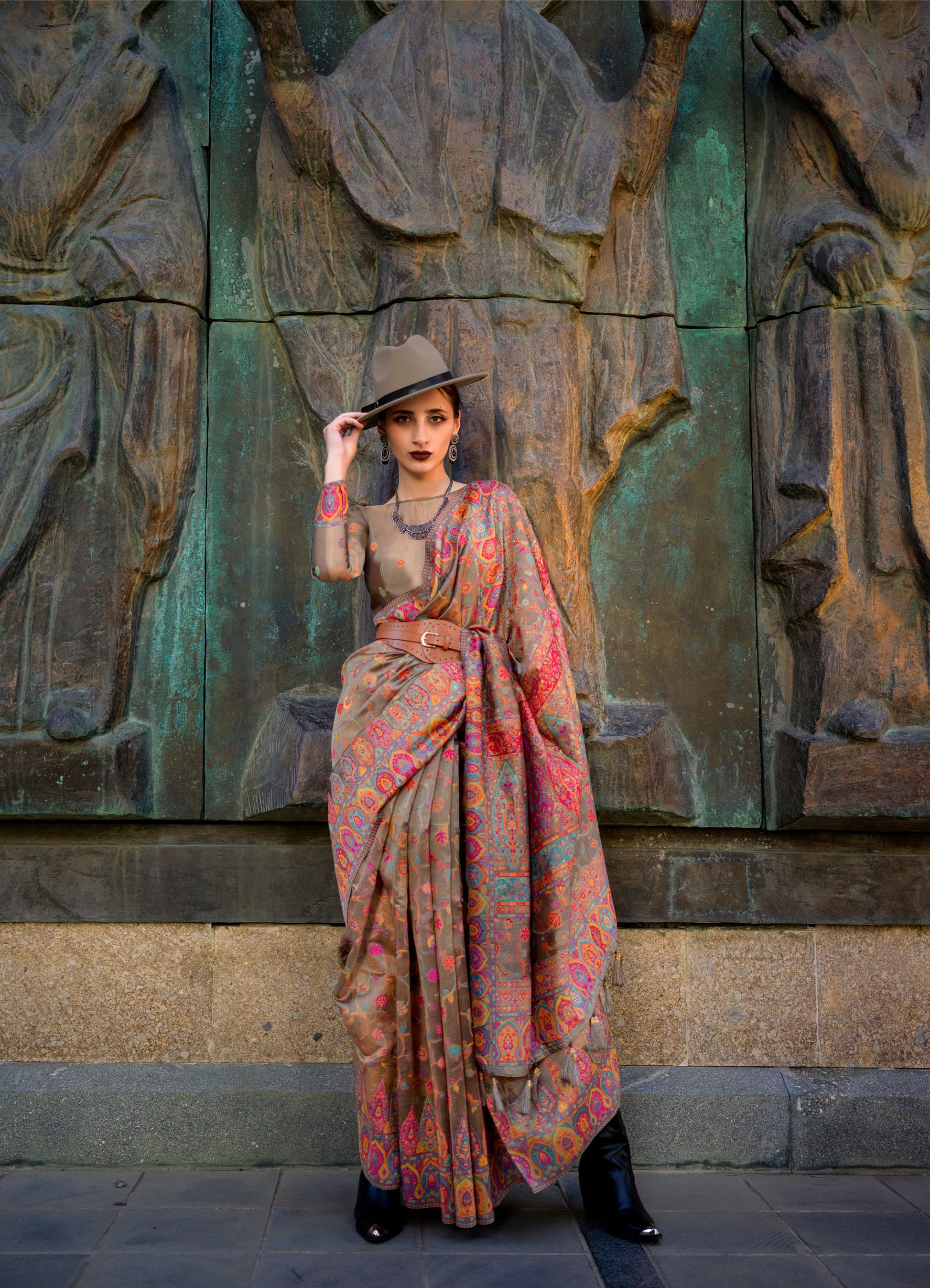 Coffee Brown Kashneer Organza Kashmiri Handloom Silk Saree