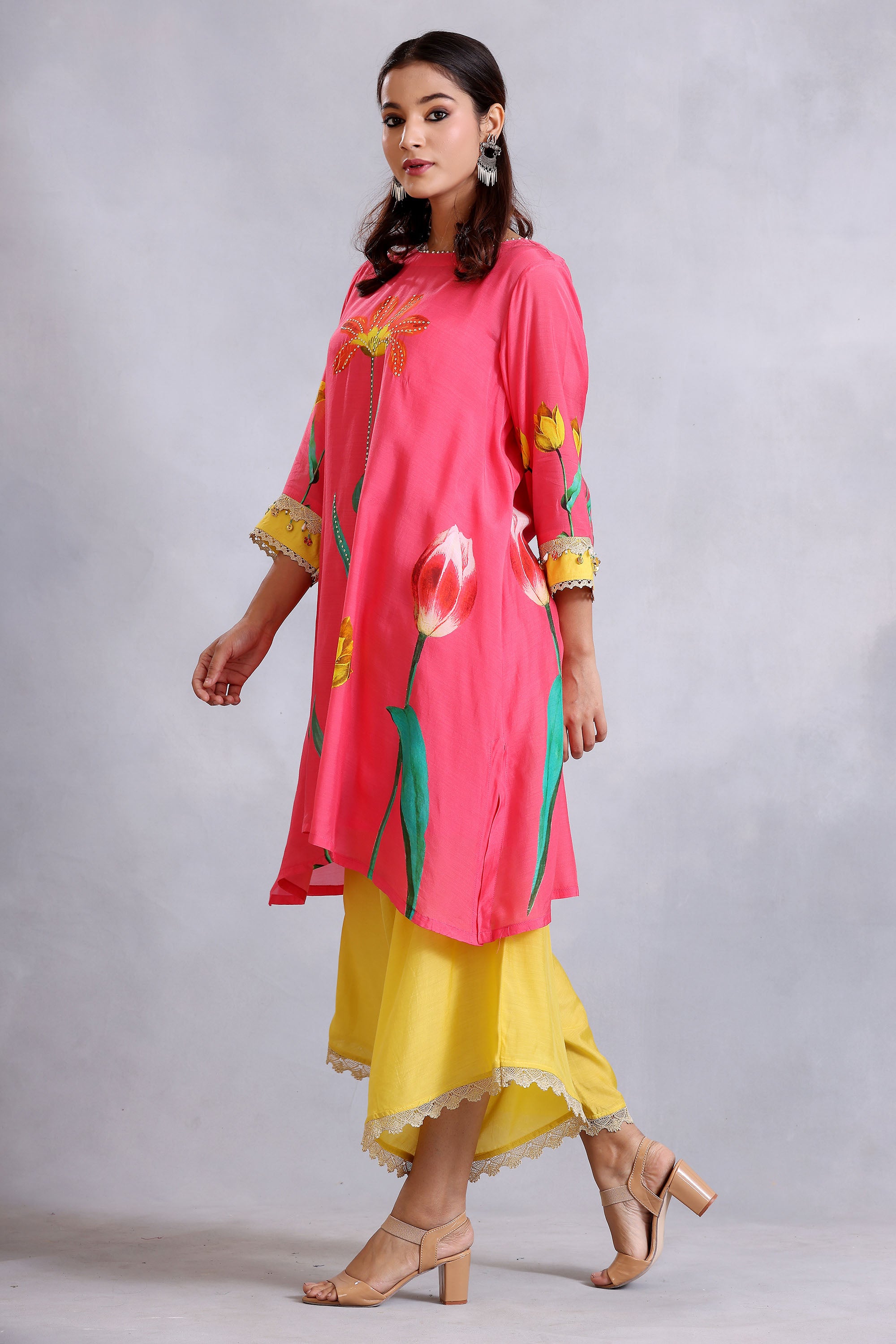 Coral pink print kurta with edging and sequins detail. It is paired with yellow draped pant.