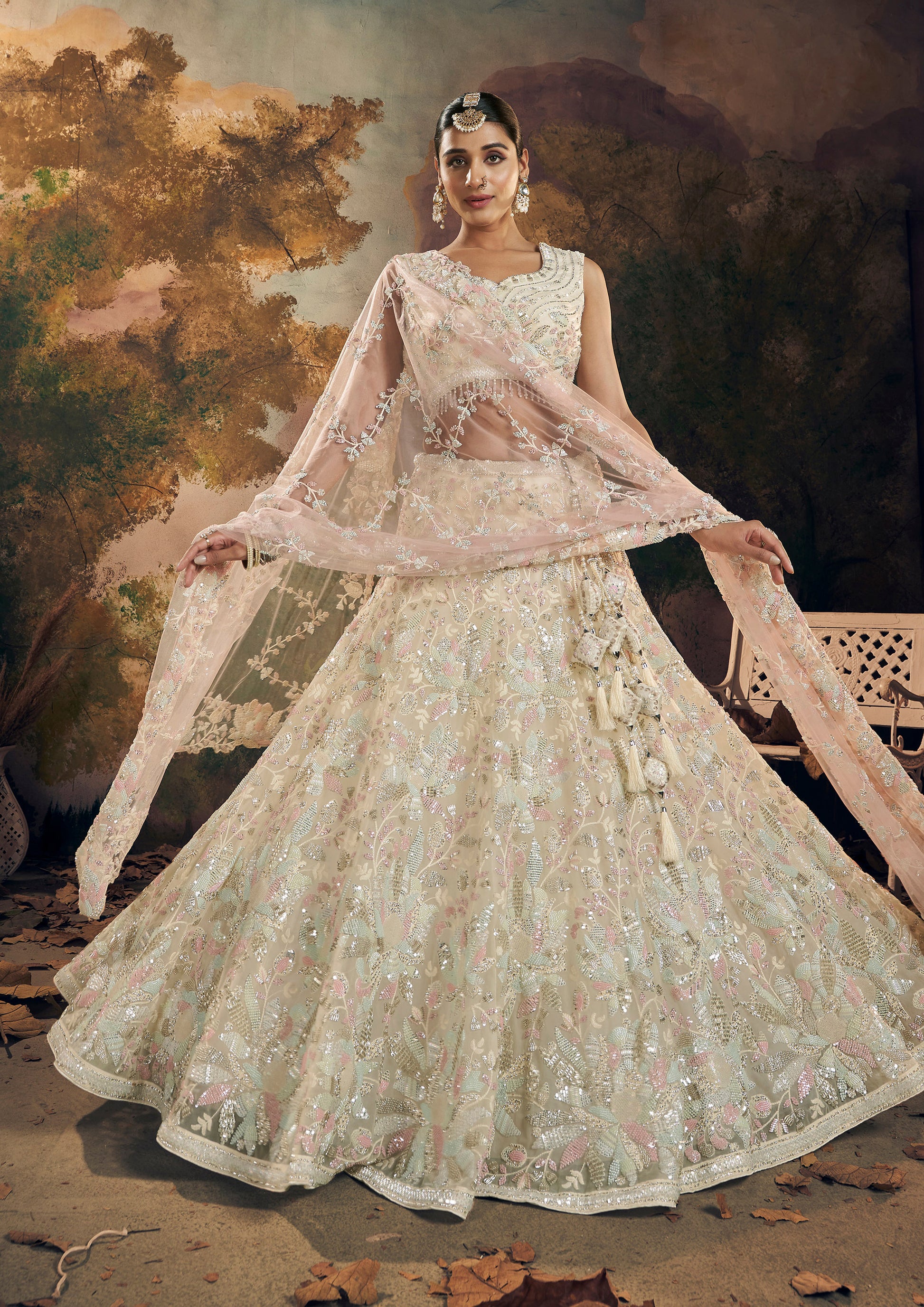 Cream Floral Embroidery and Beads Work Georgette Lehenga