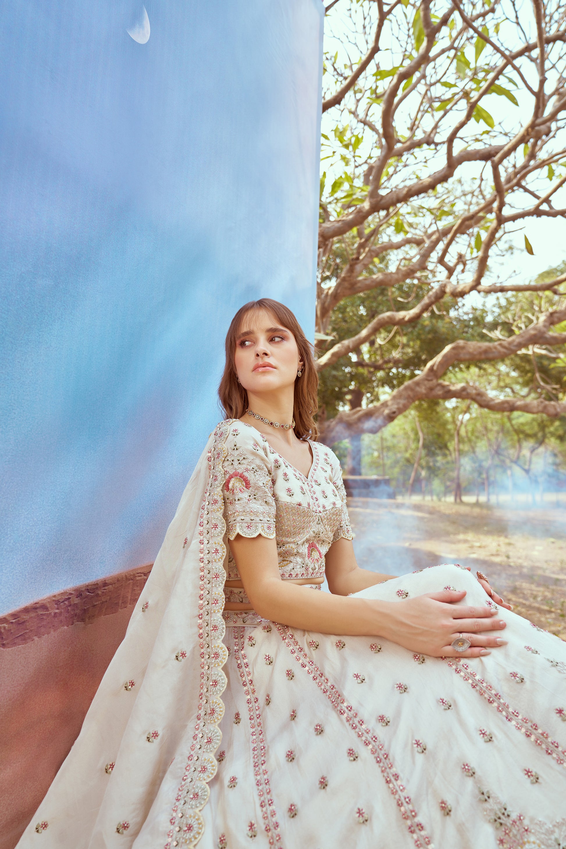 Cream Gold crushed Tissue Fabric Moti, Zari work Bridal Lehenga