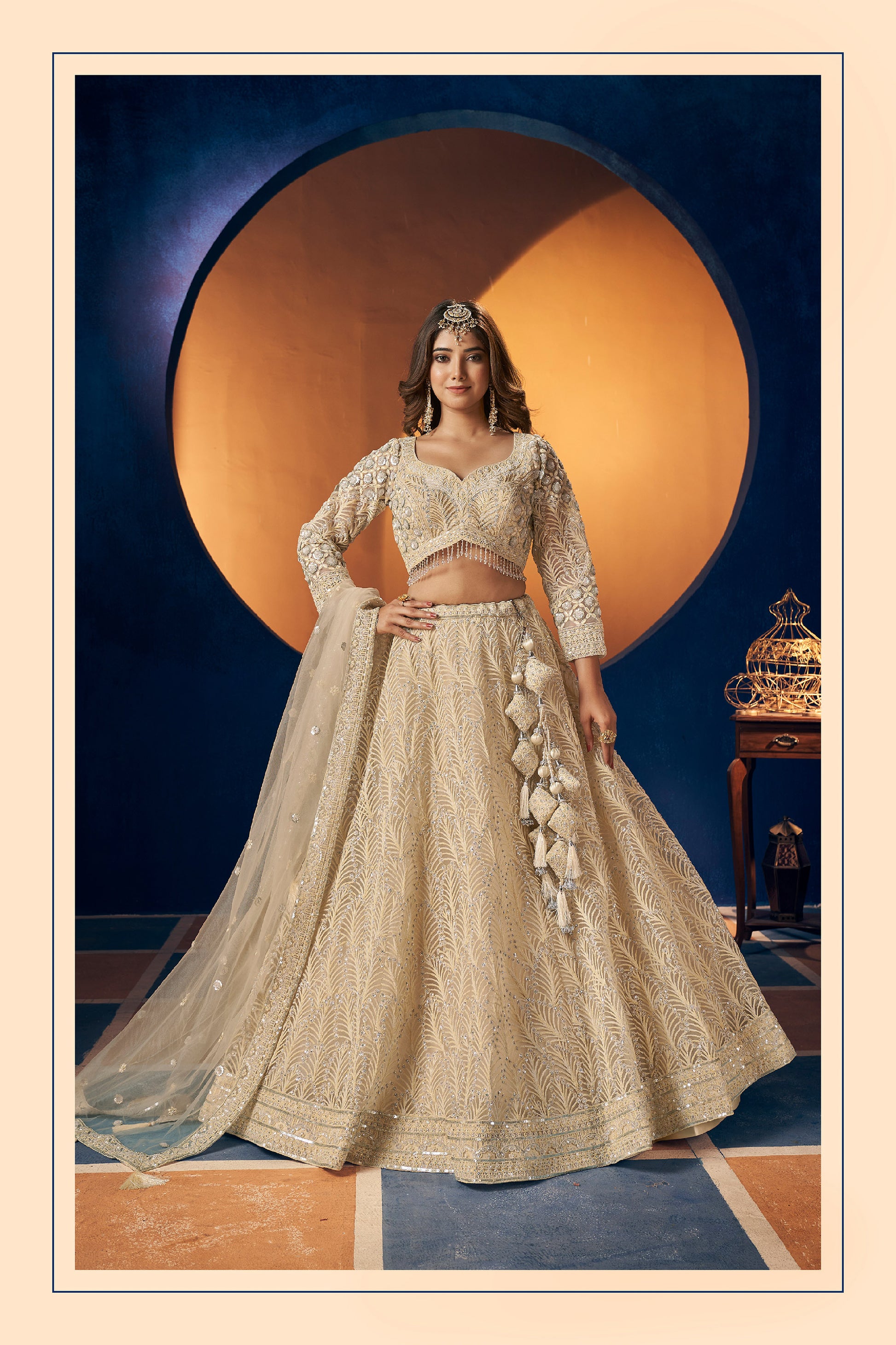 Cream Heavy Hand & Sequins Embroidery Net Engagement Lehenga