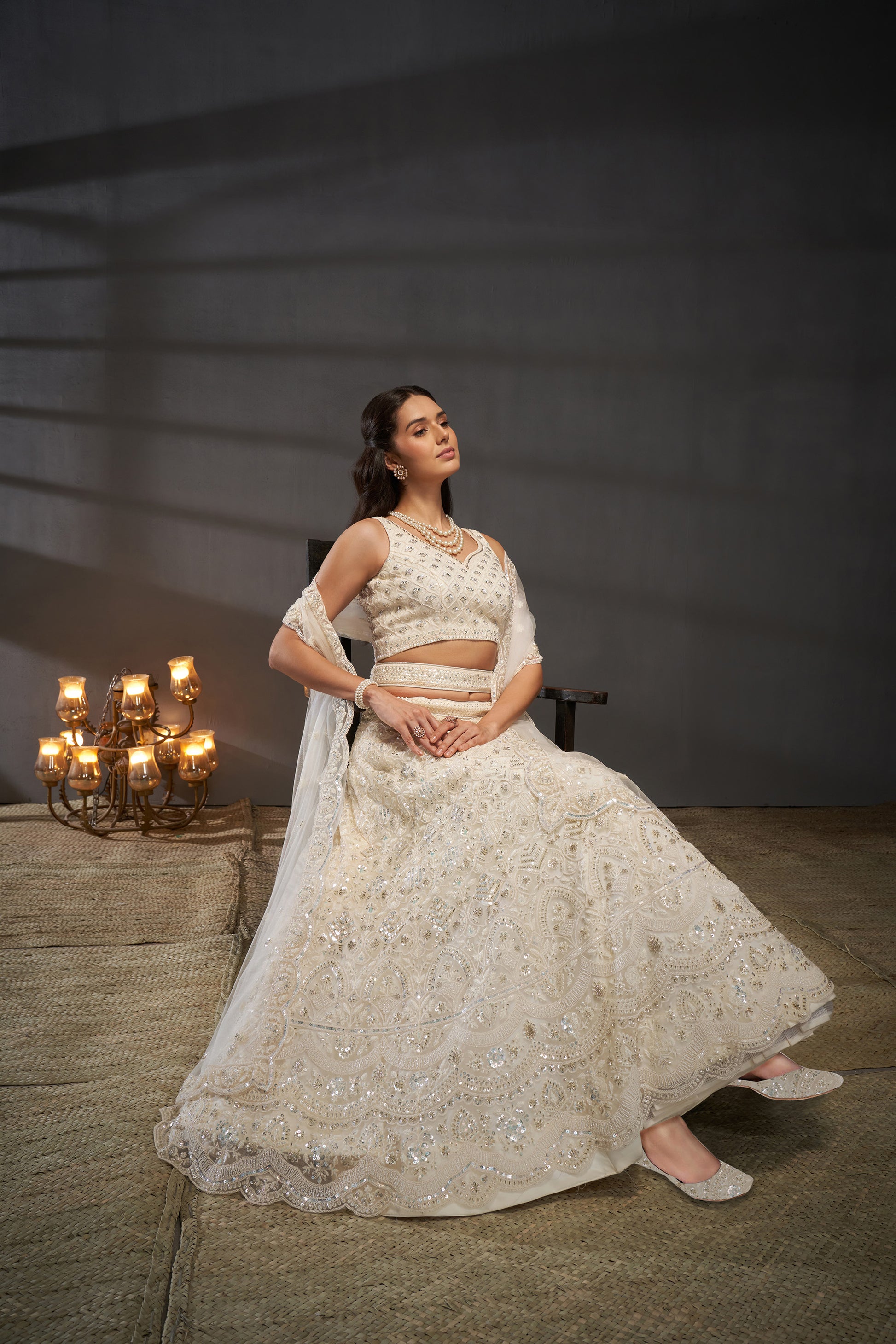 Cream Net Cutdana, Sequins and Zarkan embroidery Lehenga