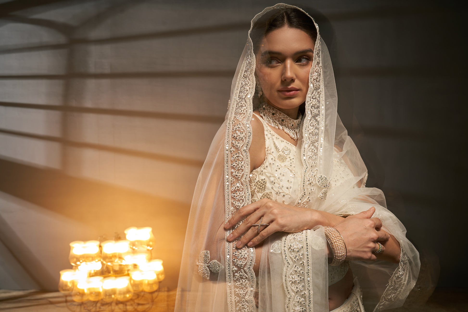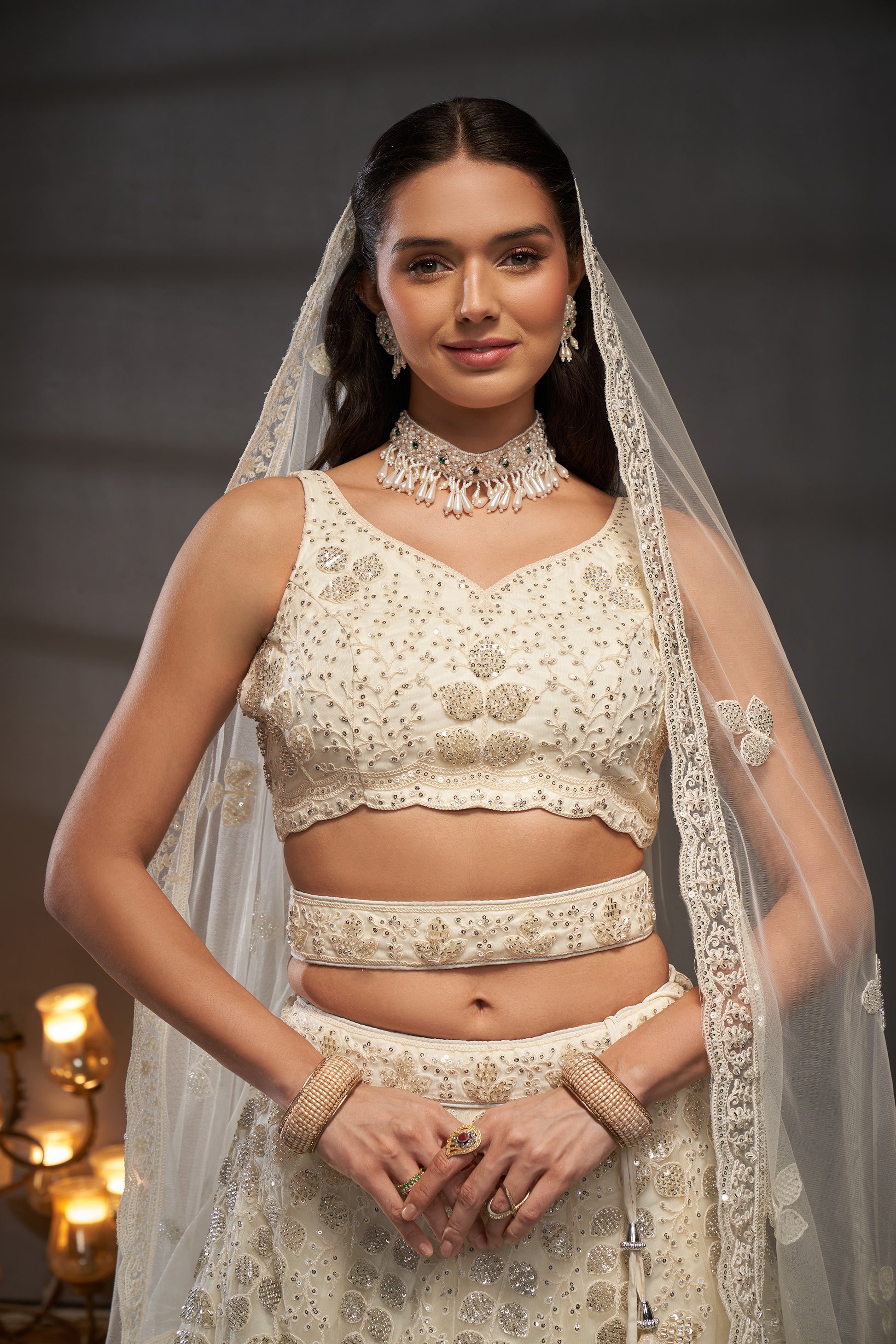 Cream Net Cutdana, Sequins and Zarkan embroidery Lehenga