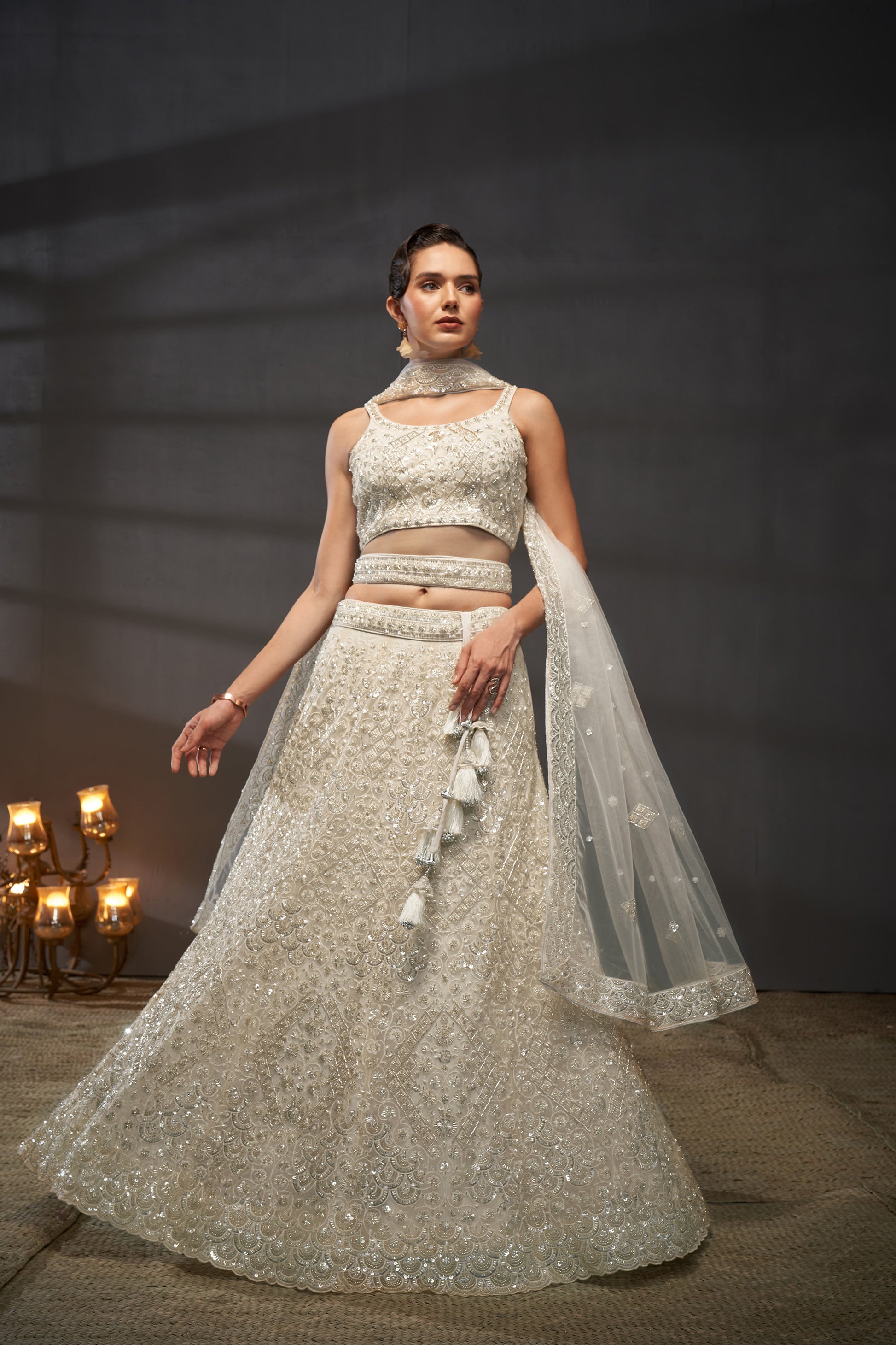 Cream Net Cutdana, Sequins and Zarkan embroidery Lehenga