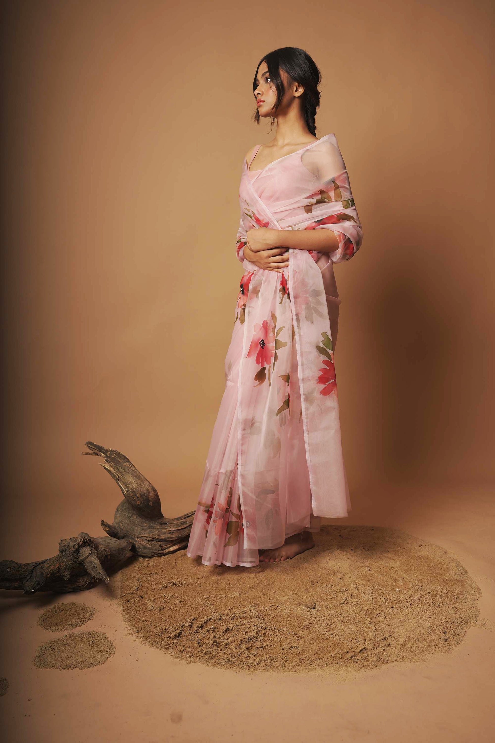 Crimson Bloom | Blush Pink Floral Handpainted Organza Saree