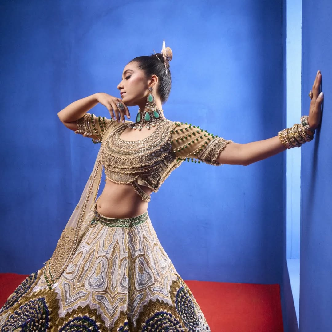 Custom Beige Eloquent Elaborate Peacock Motif Royal Bridal lehenga