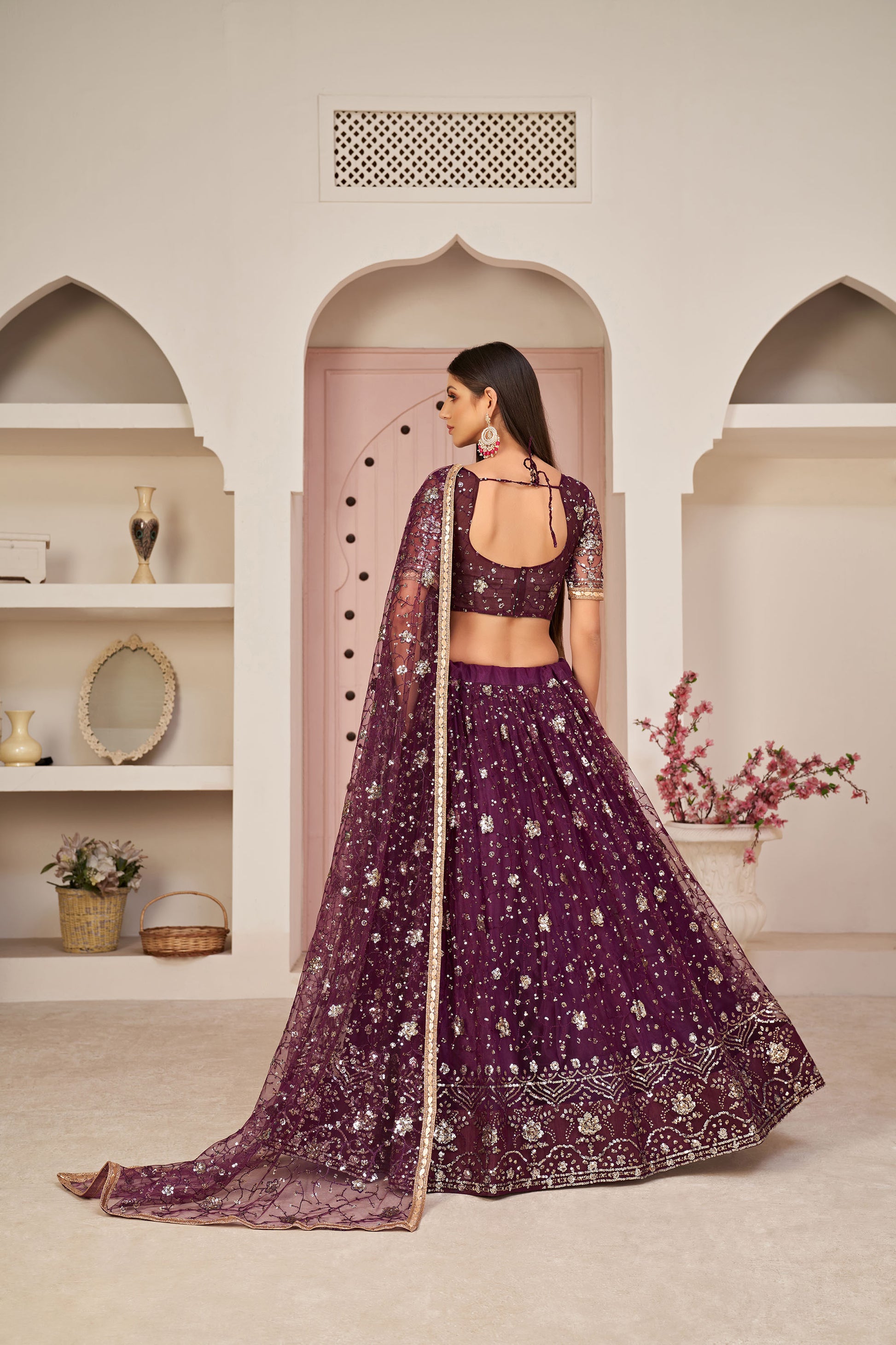 Dark Purple Sequins Embroidered Net Reception Lehenga