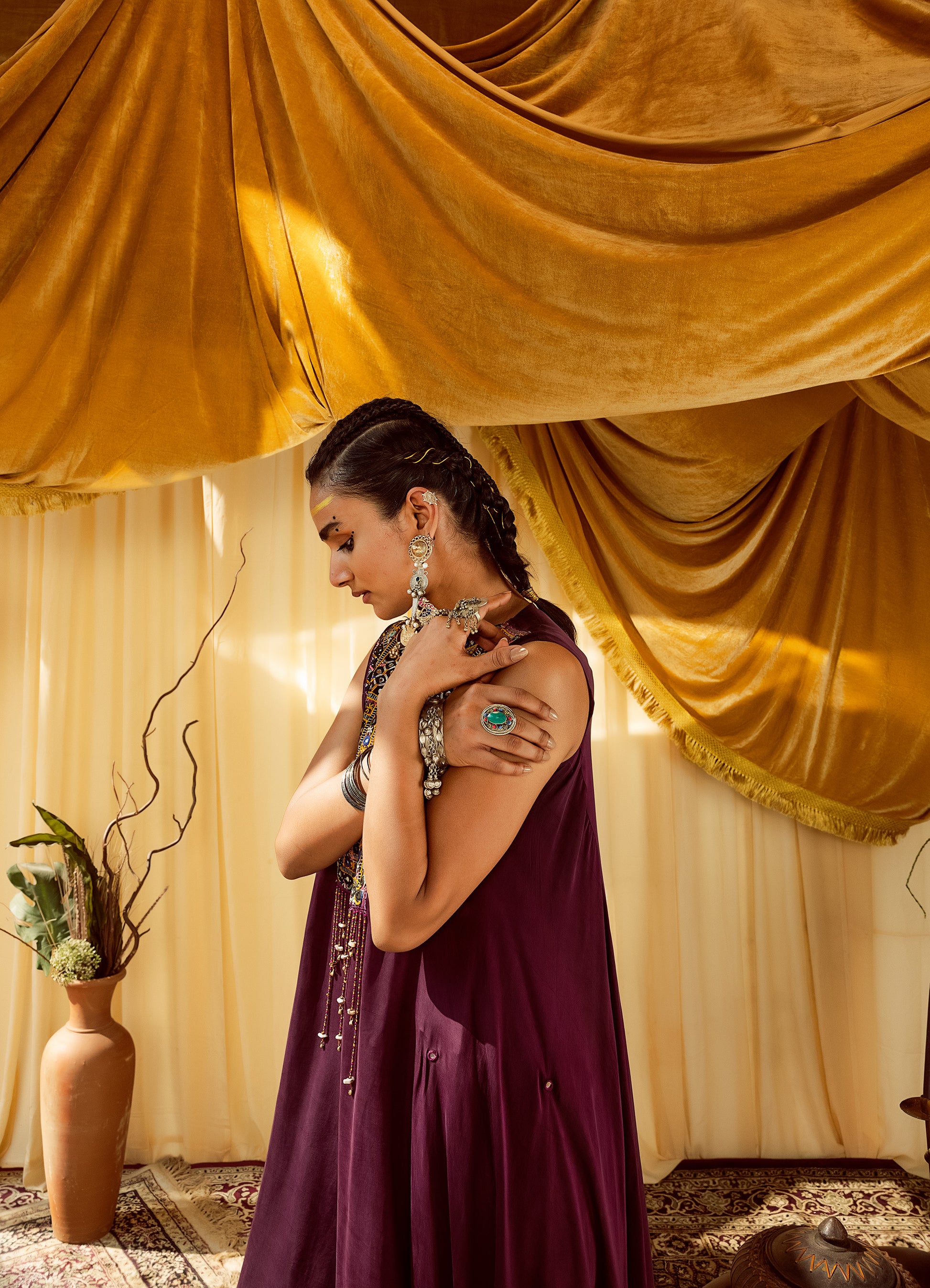 Asymmetrical wine kurta that features hand embroidered & mirror work embellished patched neckline with a unique tassel detail, paired up with pants.