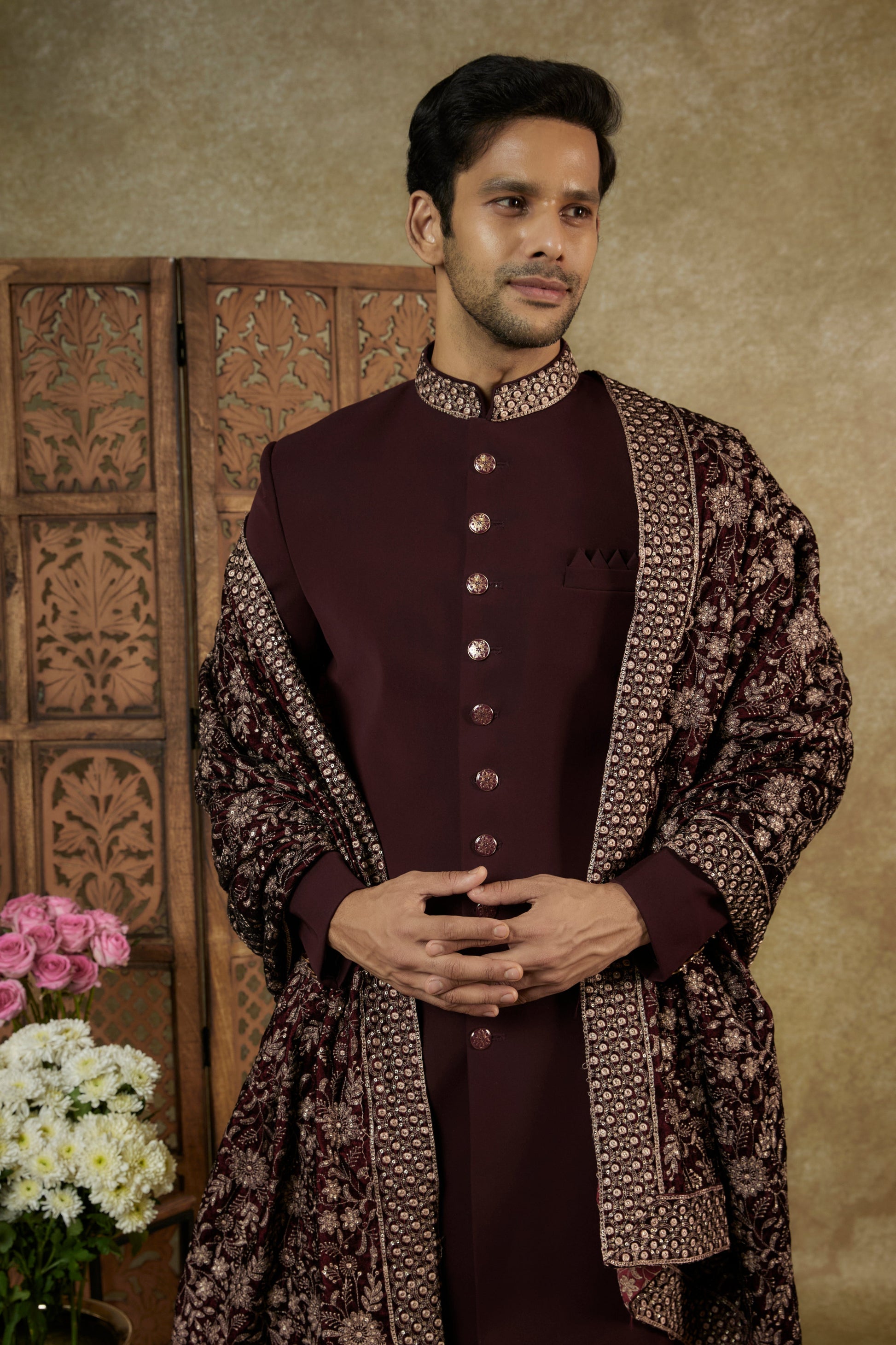 DEEP MAROON LUCKNOWI VELVET NAWABI SHERWANI SET