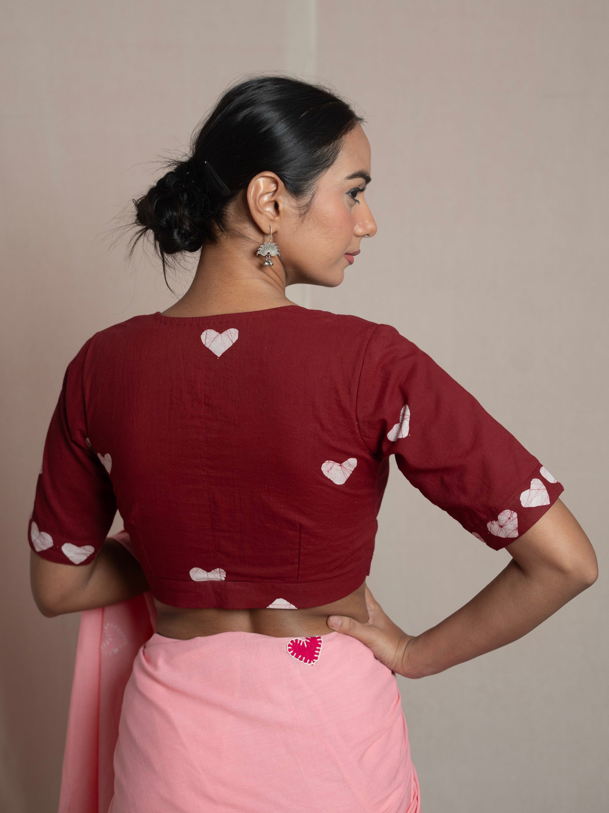 Indulge in luxury with the Dilruba Blouse. Handblock printed by skilled artisans from Sanganer, this beautiful blouse features a deep neckline with cute heart details. The padded design and comfortable cotton lining make it both stylish and comfortable. Complete with a side zipper closure, this blouse is a must-have for any fashion-forward individual.