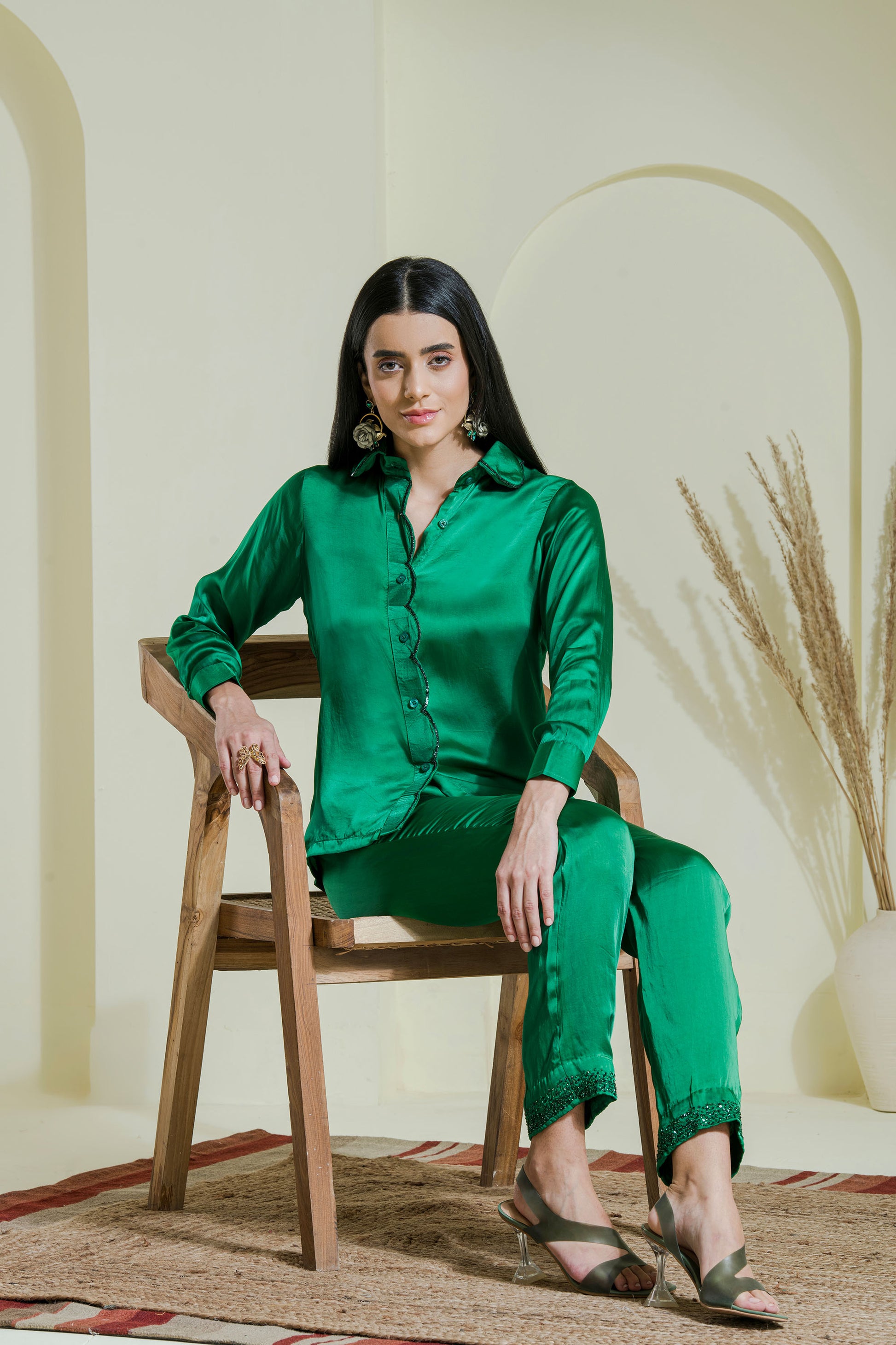 If you are a fan of jewel tones then this shirt set is the right pick for you.Step into casual sophistication with our emerald green shirt with scallop cutwork detailing on collar and shirt front it is paired with straight pants with scattered sequins work.Dont forget to check out the sexy back !
