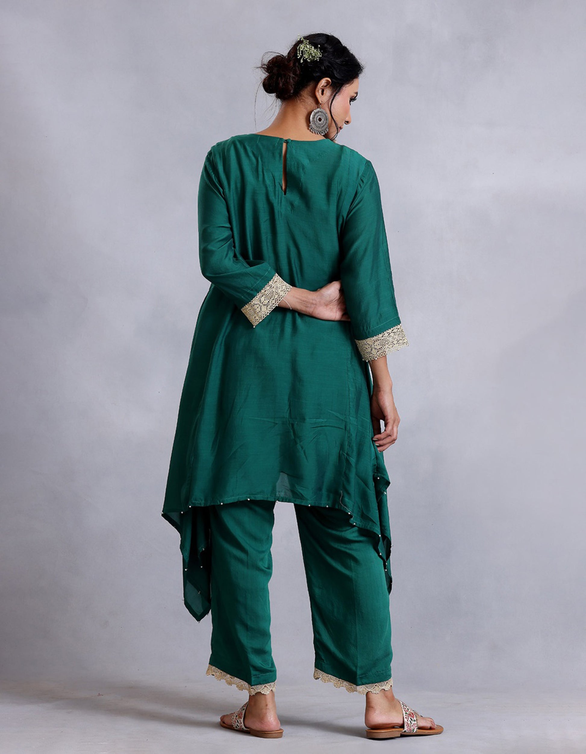 Emerald green embroidered kurta set with assymetric hem detailed with sequins and golden edging. It is paired with matching straight pant