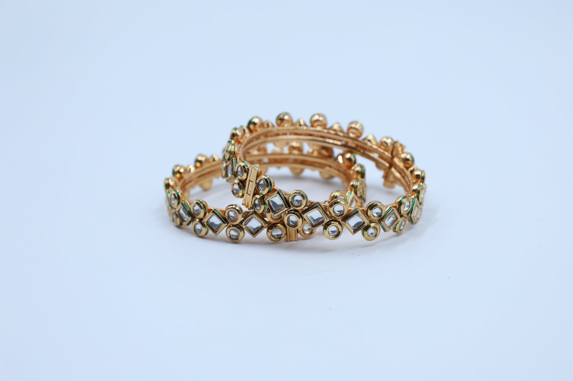 Indulge in luxury with our Handcrafted Evergreen Kundan Bangles, Set of 2. These beautiful bangles are perfect for any occasion, adding a touch of elegance to your outfit. The intricate detailing and quality craftsmanship make them a must-have for any fashion-forward individual. Elevate your style with these timeless pieces.