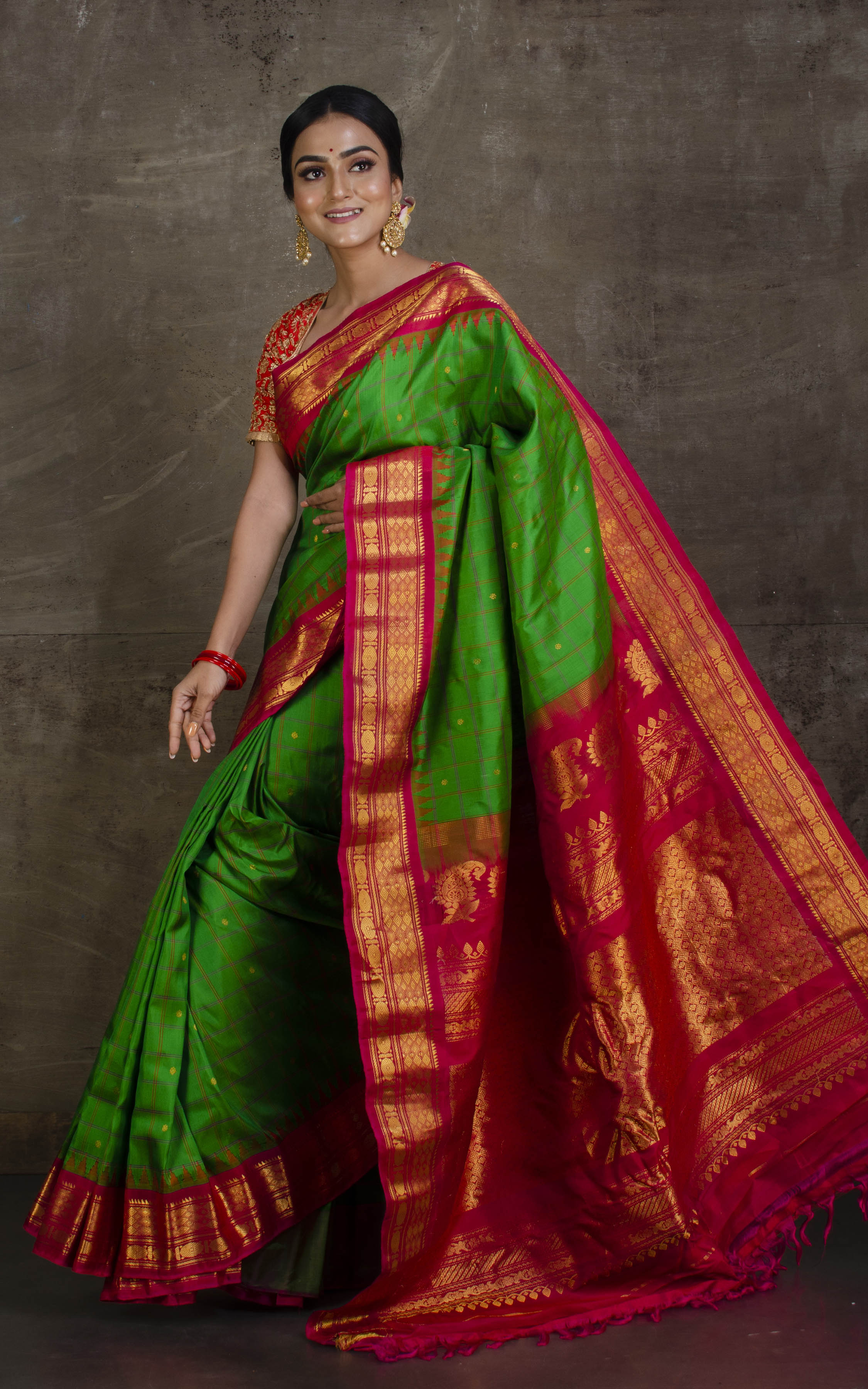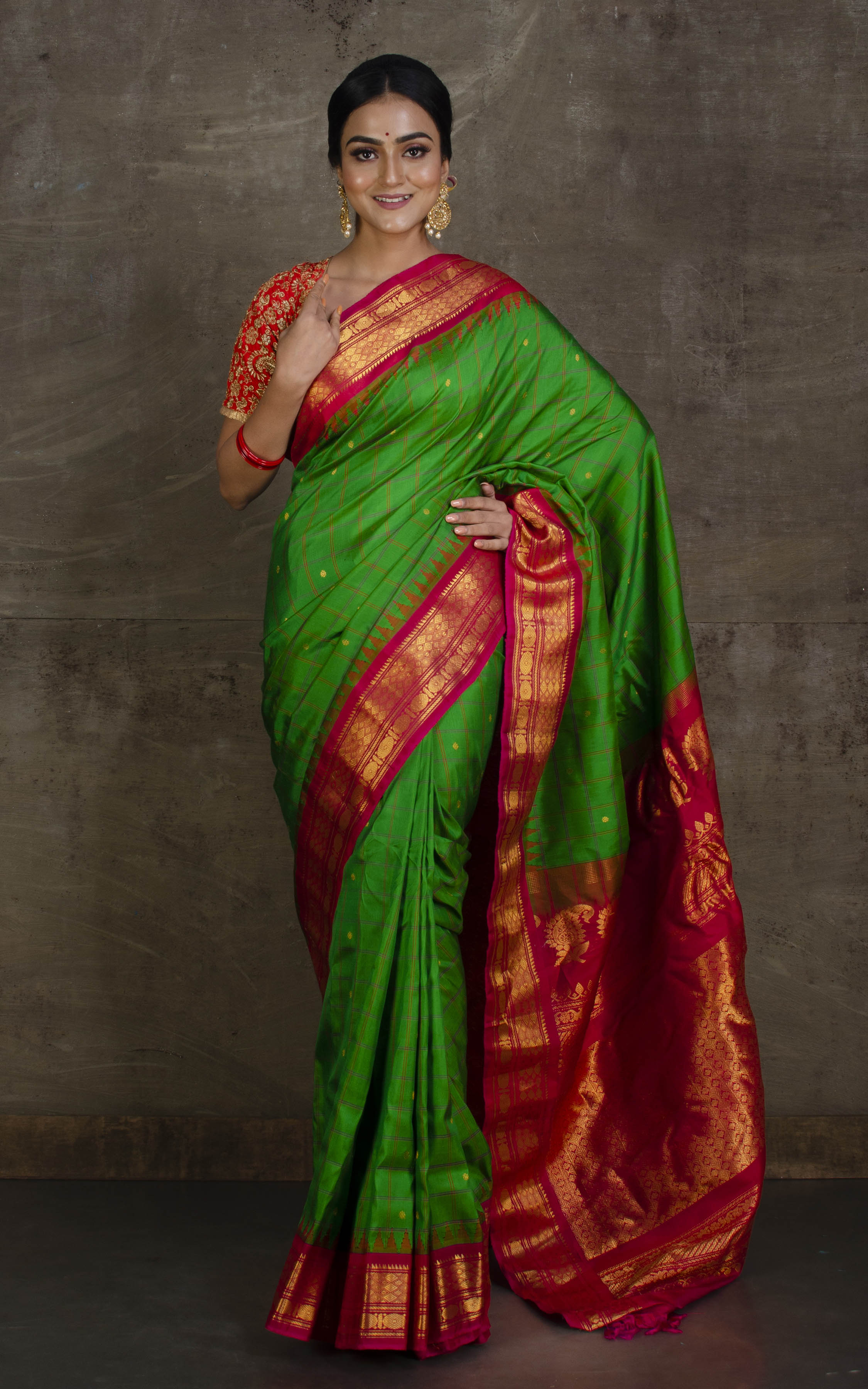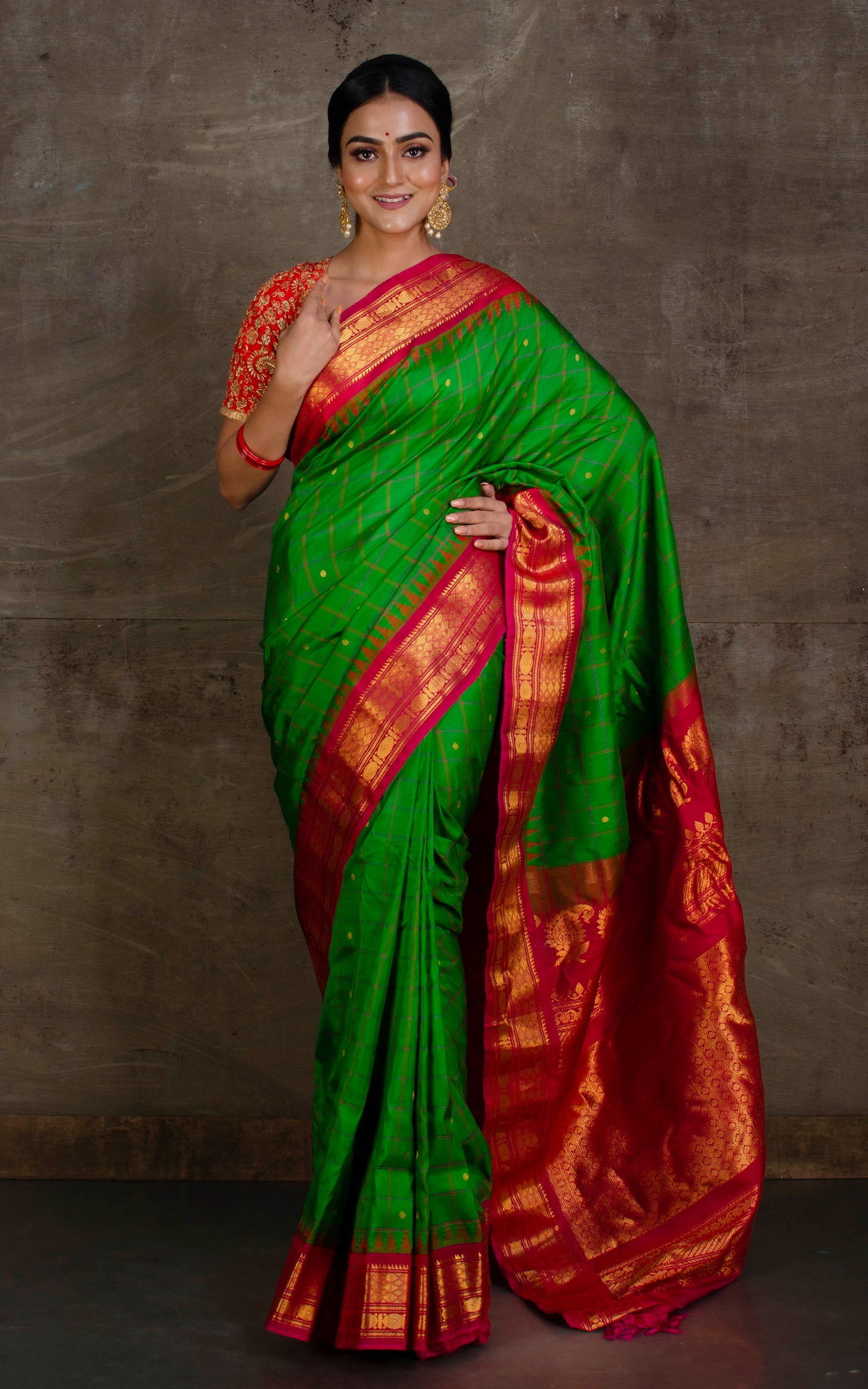 Exclusive Checks Gadwal Silk Saree in Green, Red and Golden Zari Work