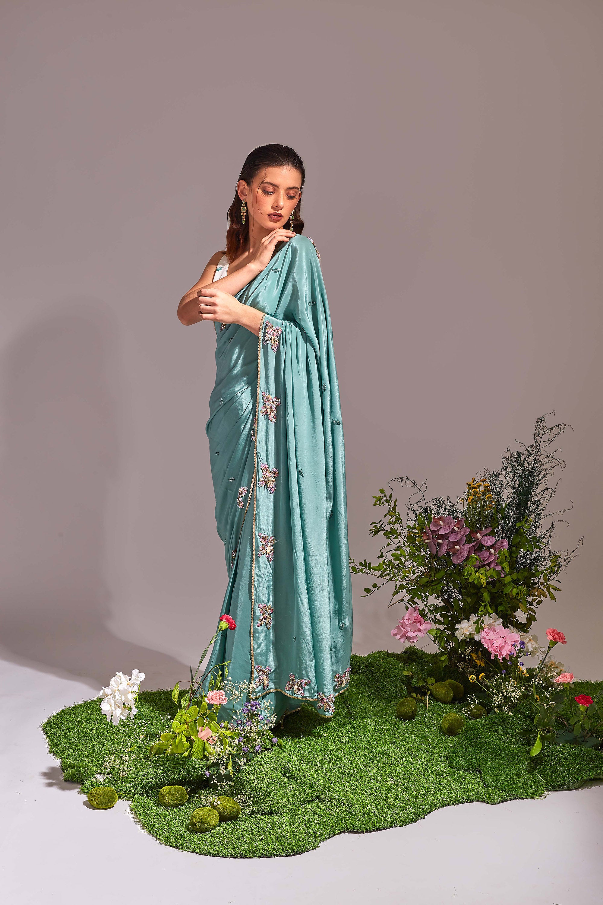 Elevate your style with our exquisite hand-embroidered drape saree, accompanied by a stunning color-block blouse featuring a chic tie-up back closure.