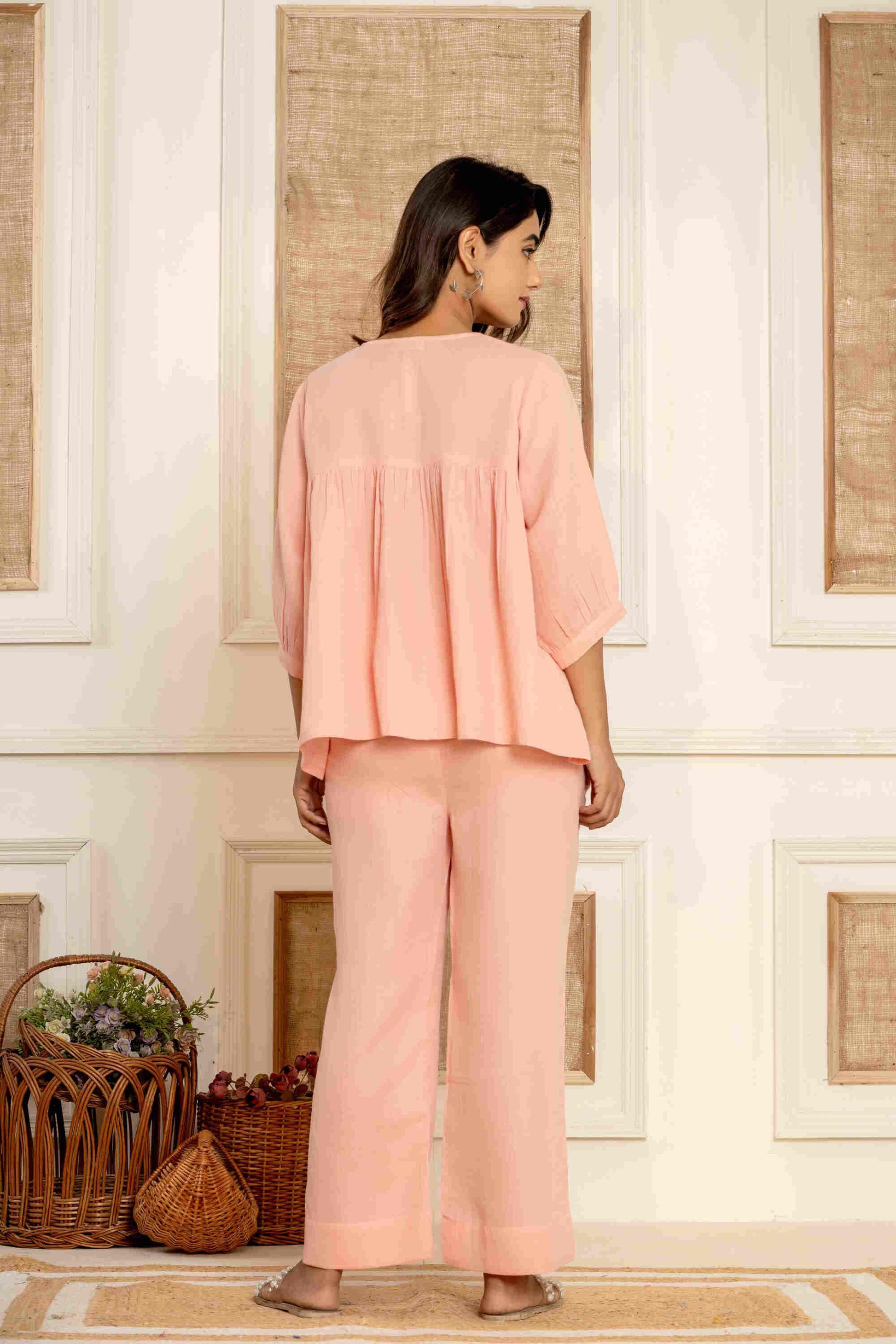 Paizlie Fuzzy Peach loungewear set is designed for those slow, sun-drenched mornings and unhurried evenings at home. Crafted from cloud-soft, breathable organic cotton gauze, it’s pure ease against your skin—light, airy, and free from synthetics.