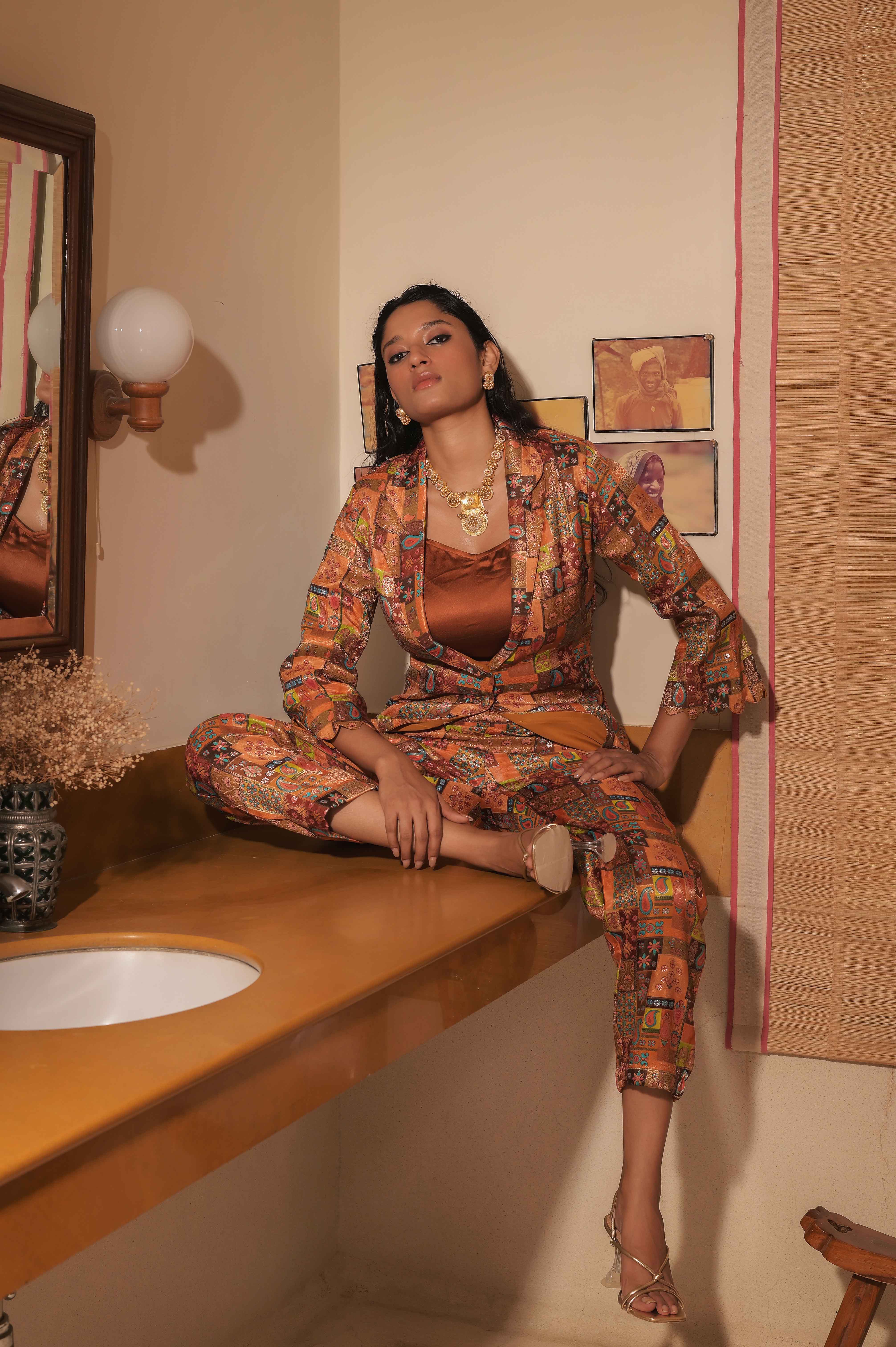 Revive yourself in the warmth of our Golden Harvest Mustard Brocade Blazer Set with Pant. Made from luxurious mustard gold brocade, this fit radiates opulence and charm. Perfect for those who appreciate bold yet refined fashion choices.