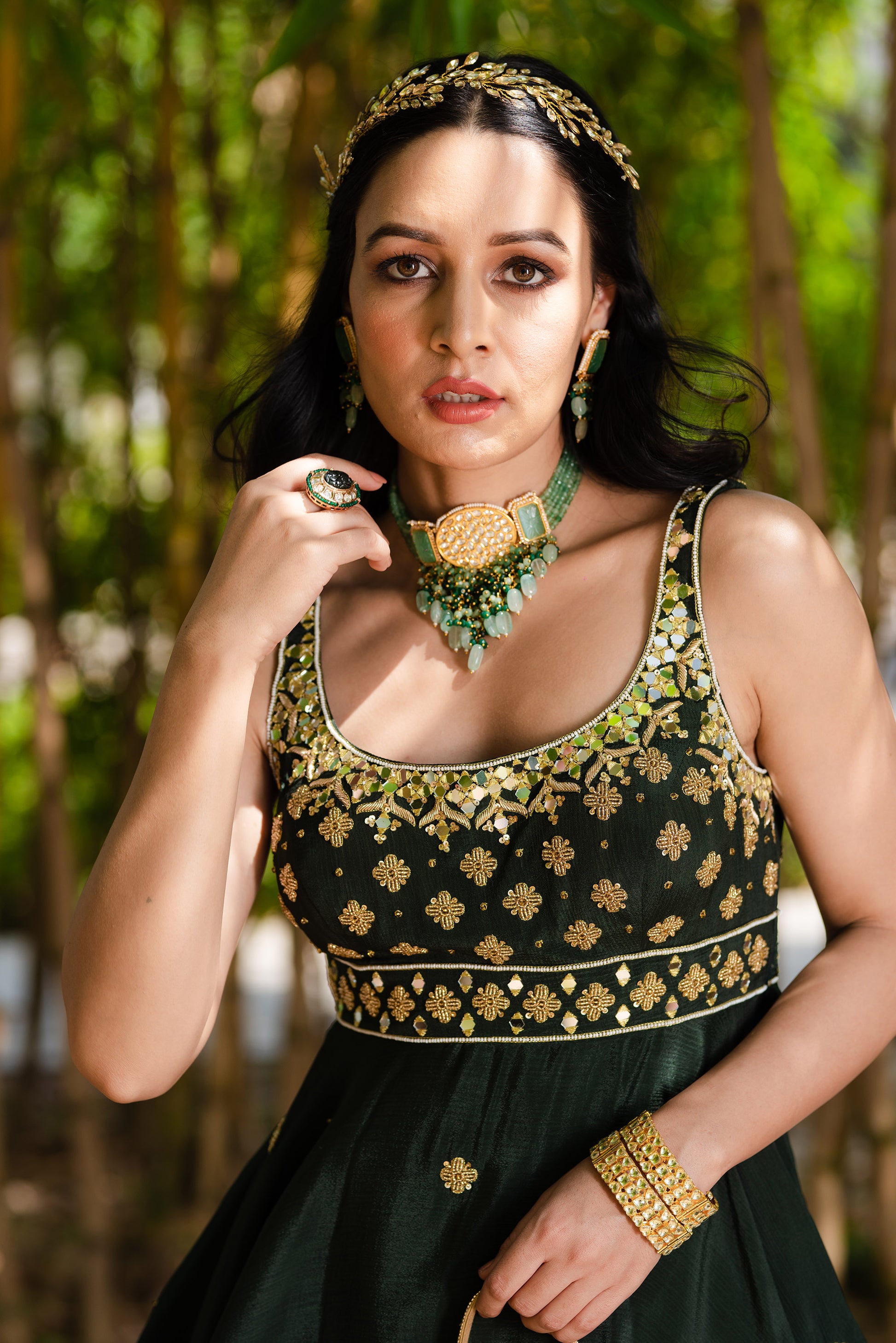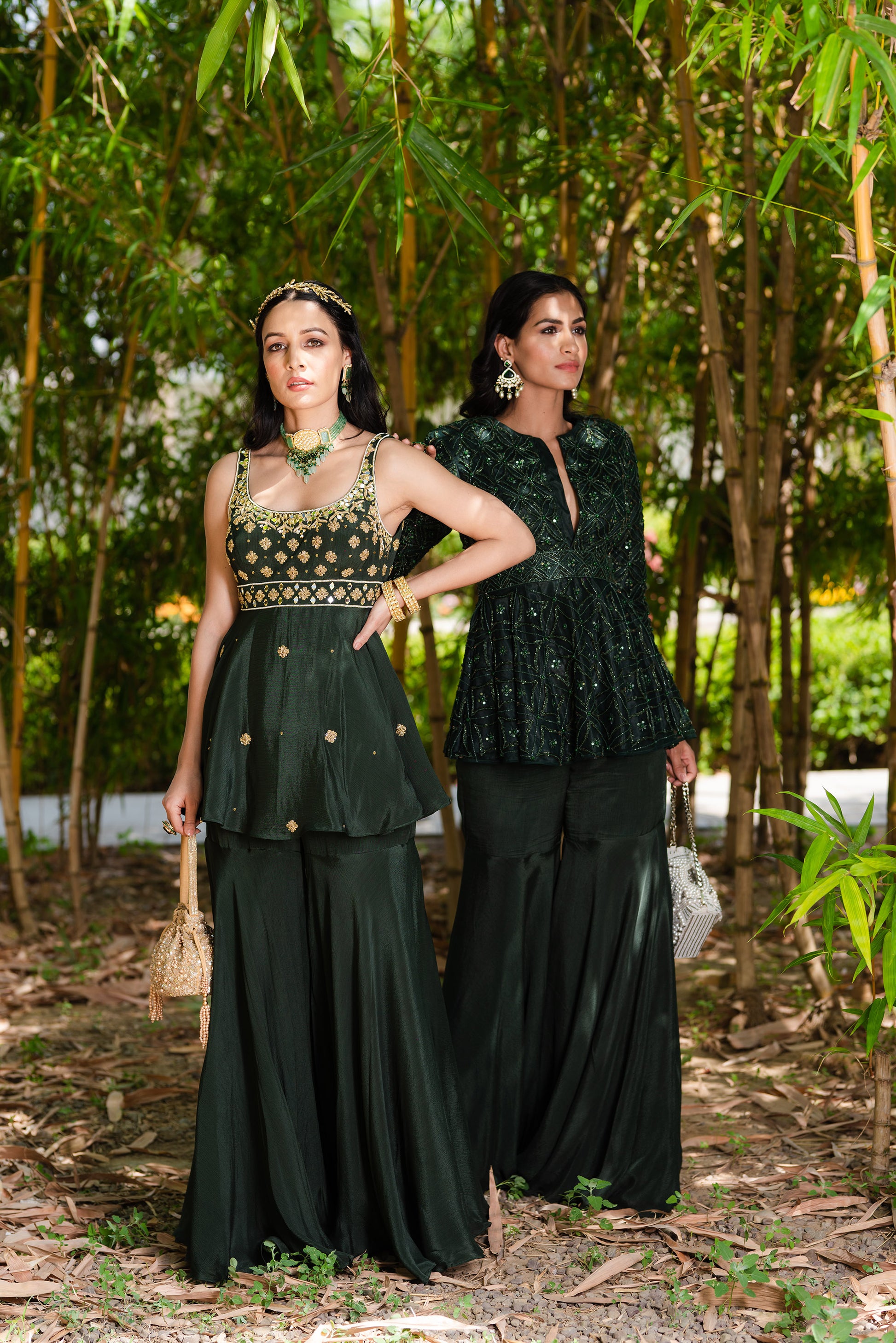 Dark Green Peplum Kurta paired with Chffon Sharara Pants and Chiffon Choker Dupatta