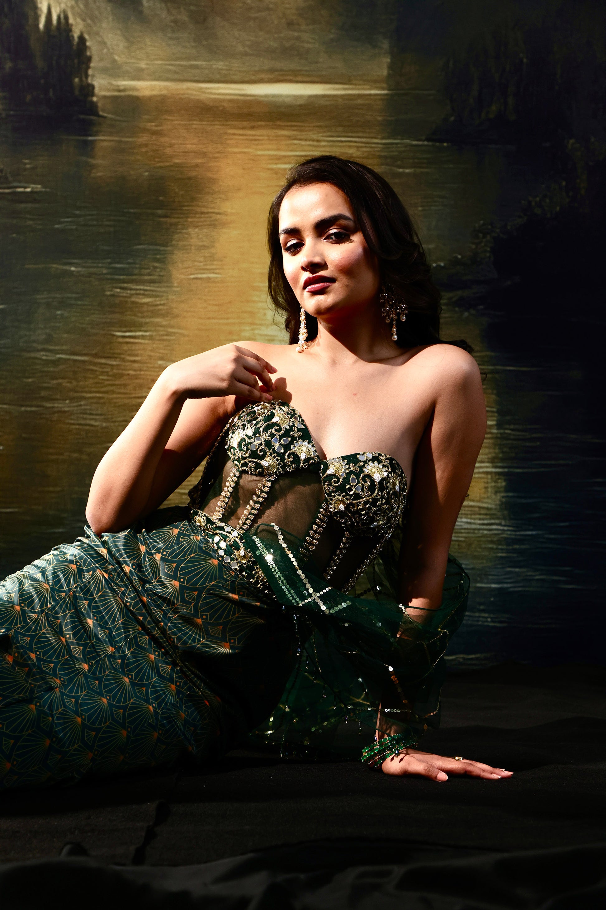 Emerald green hand embellished corset gown in net and french crepe. With a tasselled veil hand embroidered on net