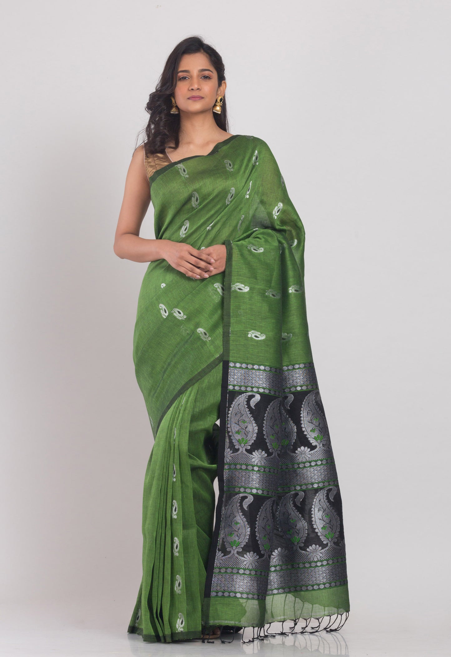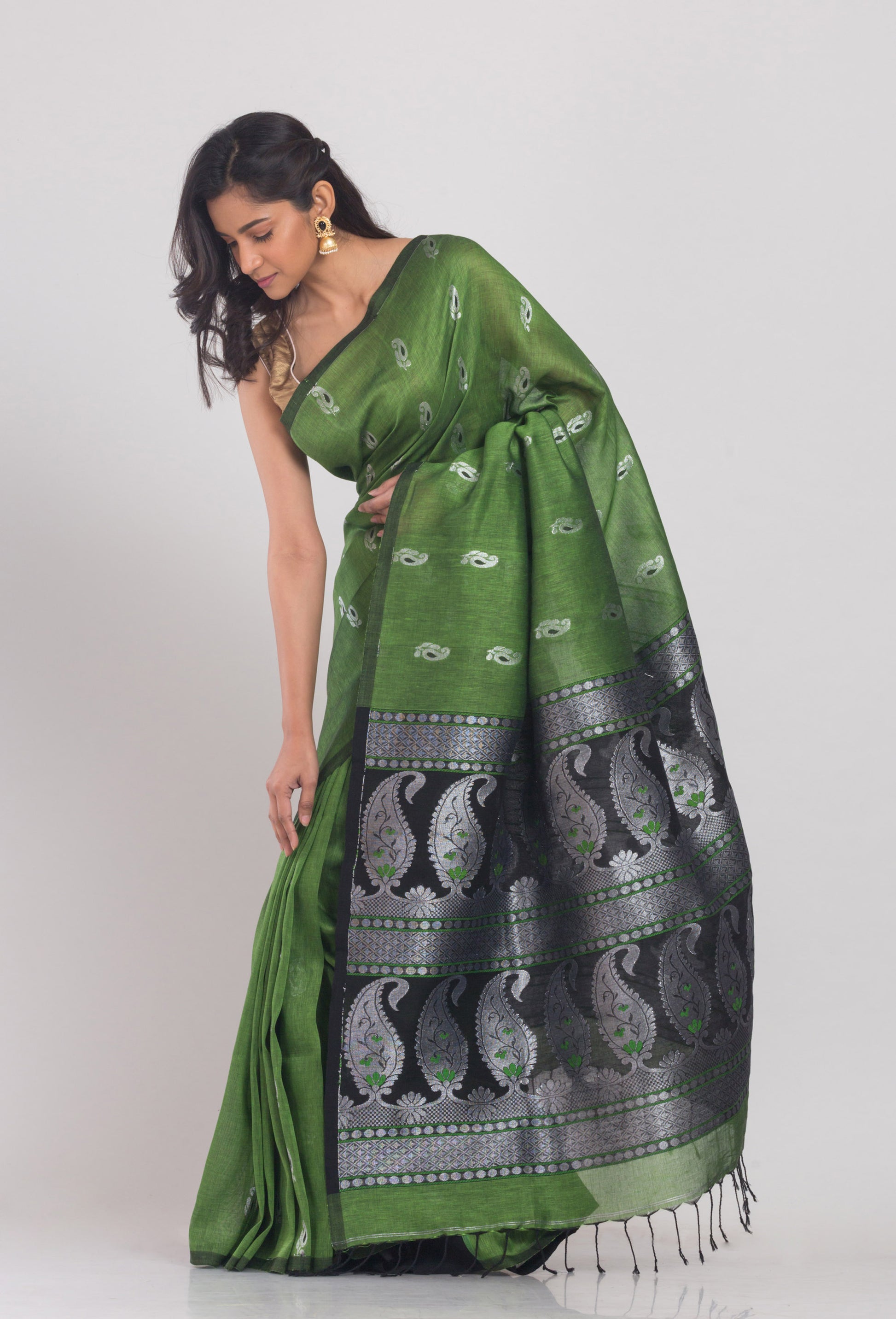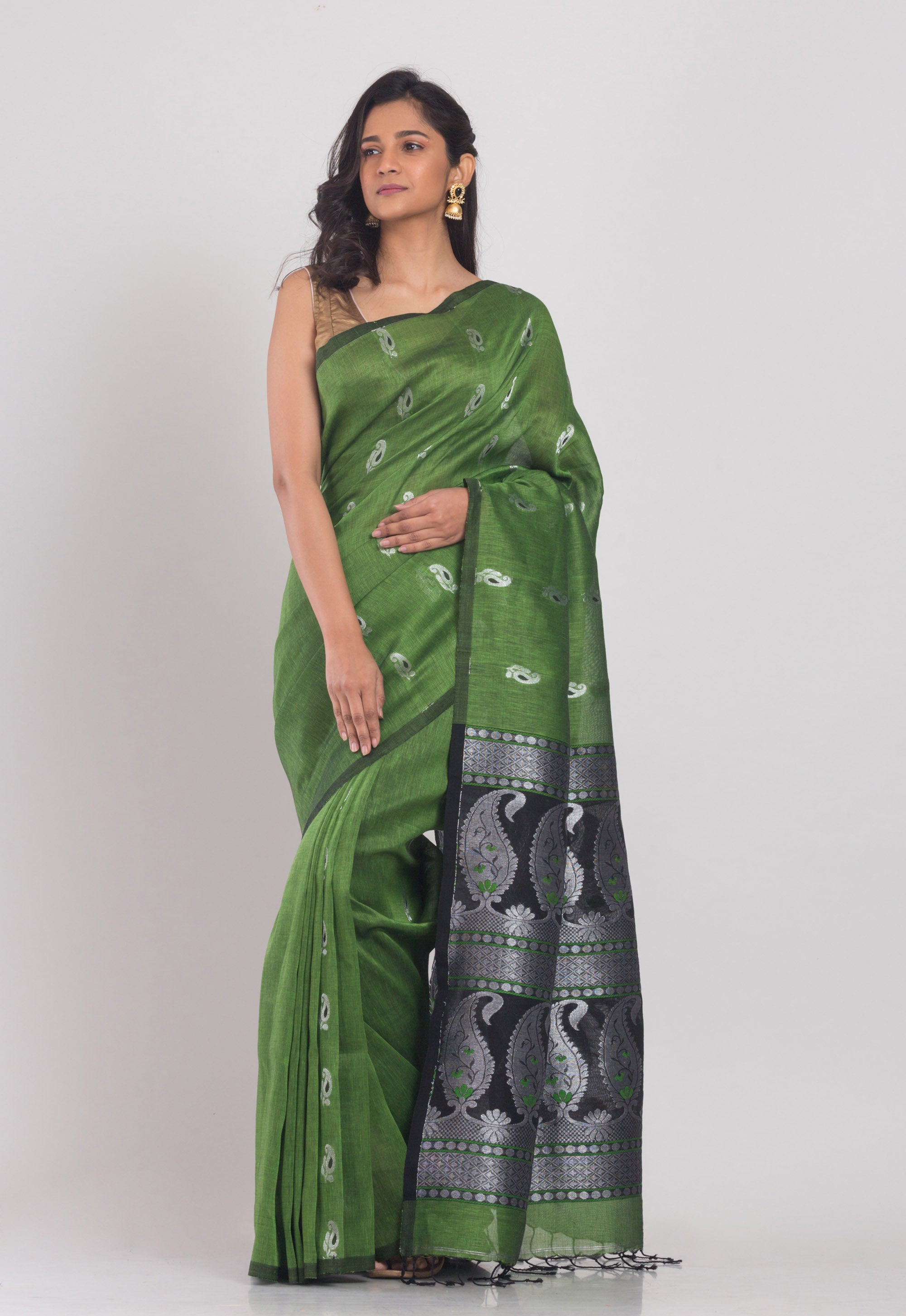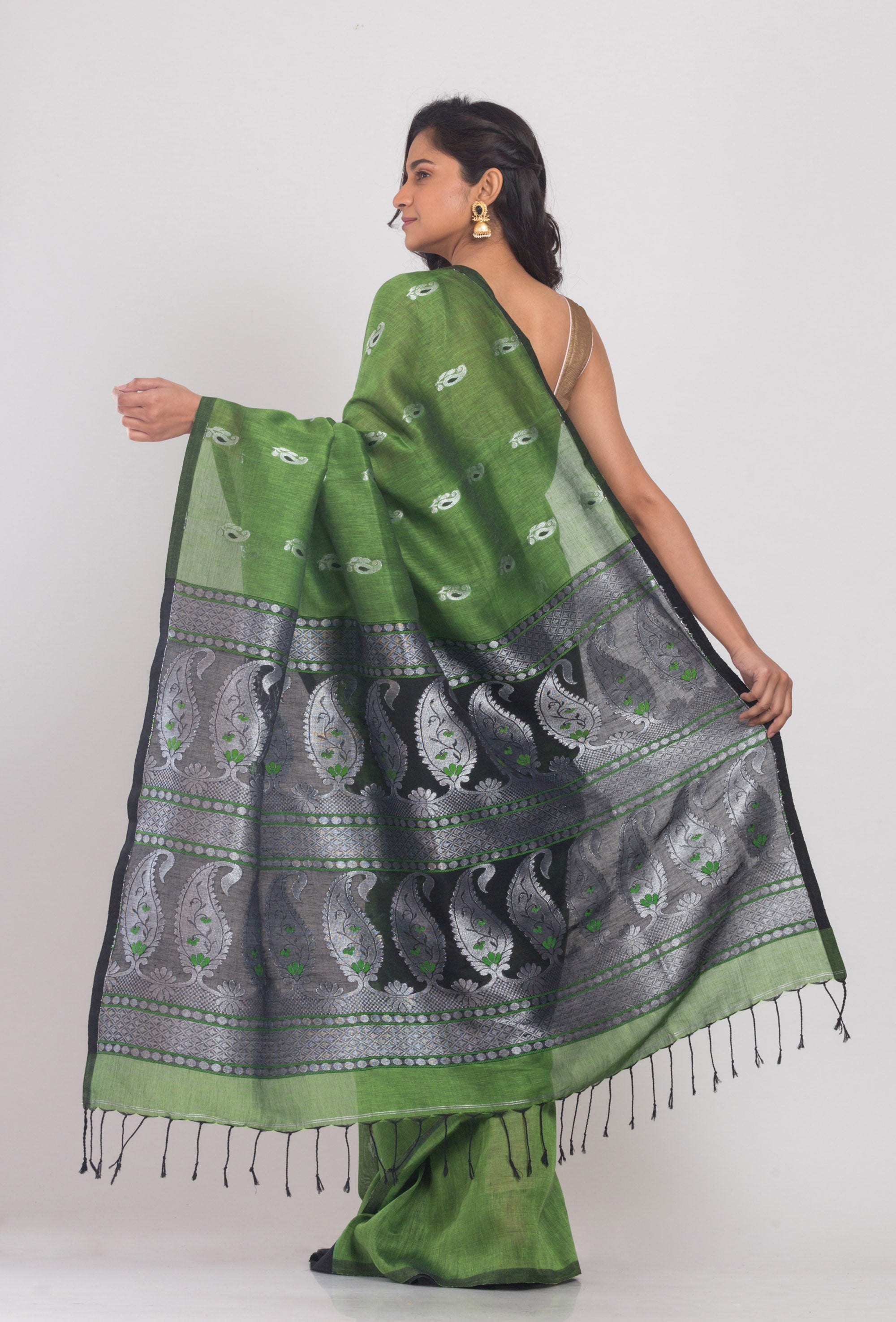 Green Cotton Linen Handloom Saree