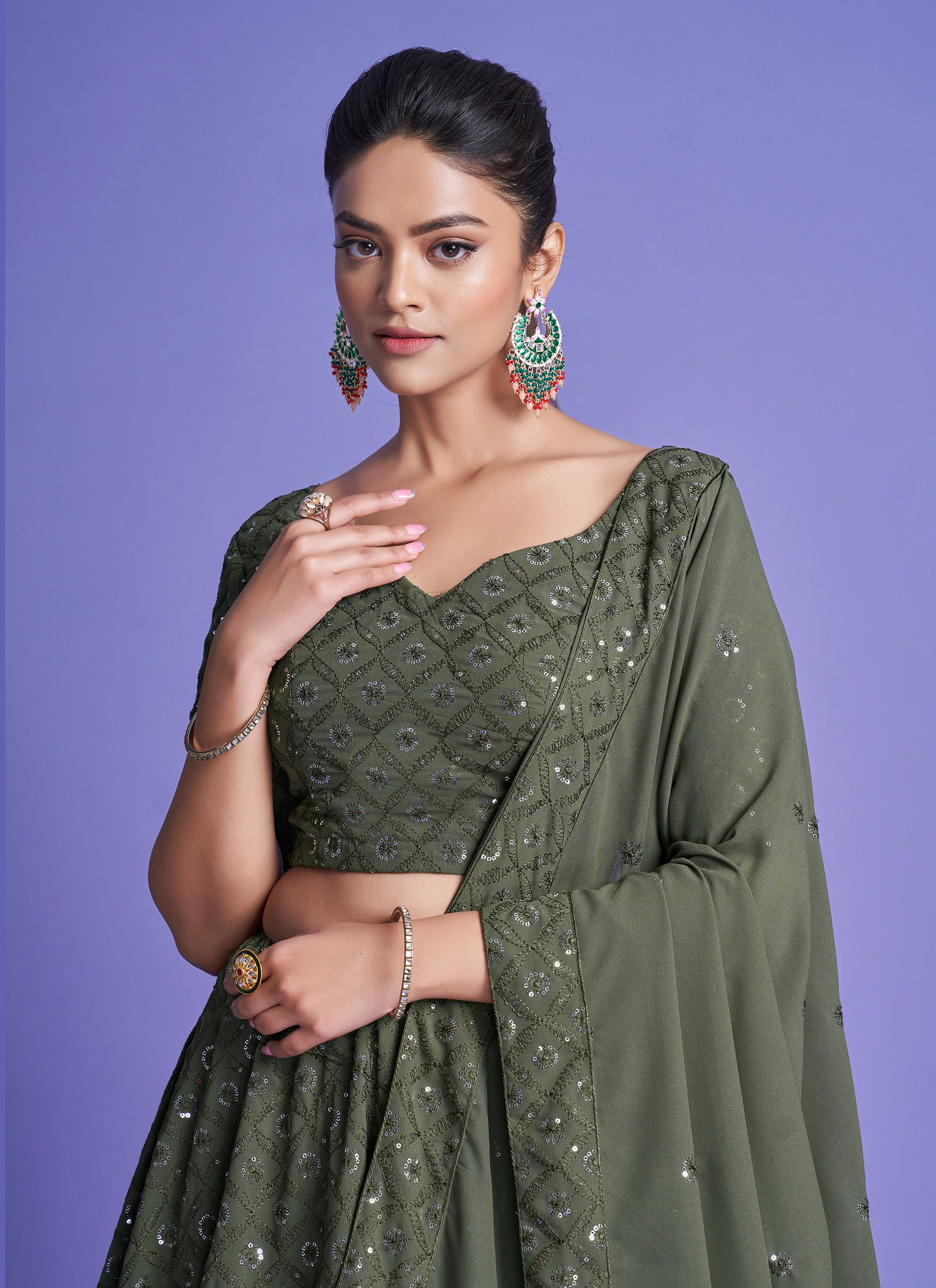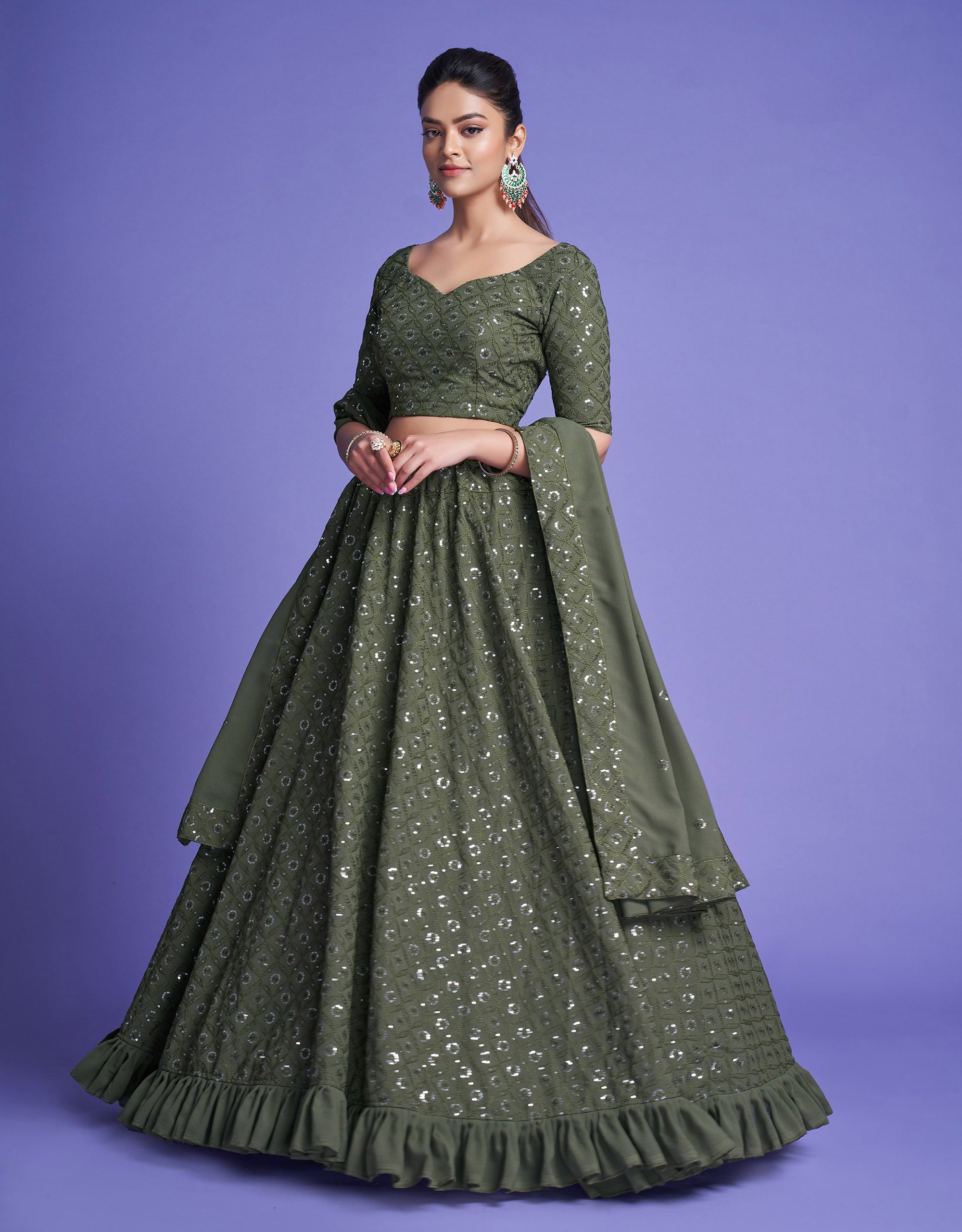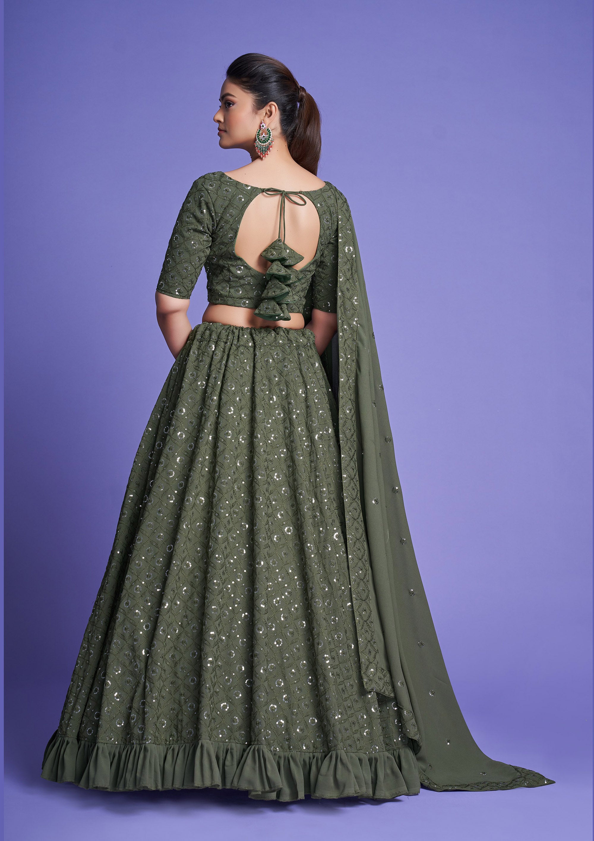 Green Diamond Georgette Sequins Work Mehendi Lehenga