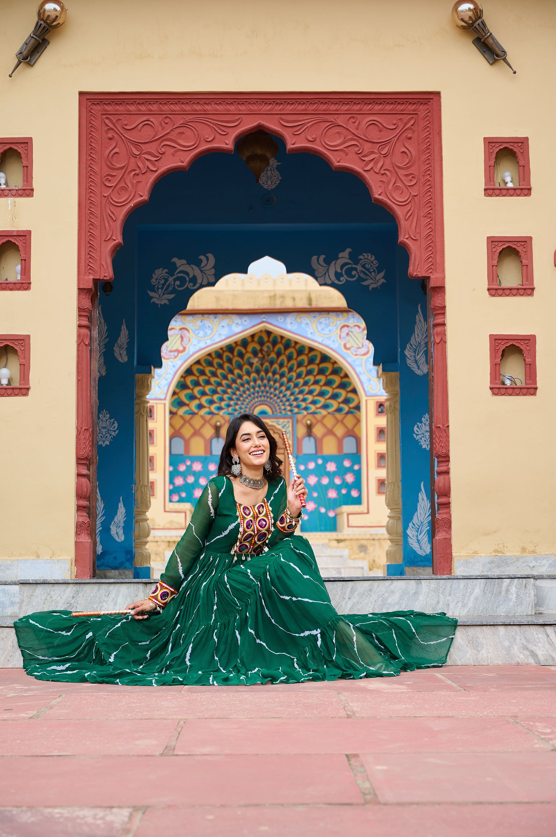 Green Faux Georgette Leheriya Print With Kutchi Patch Work Navaratri Gown