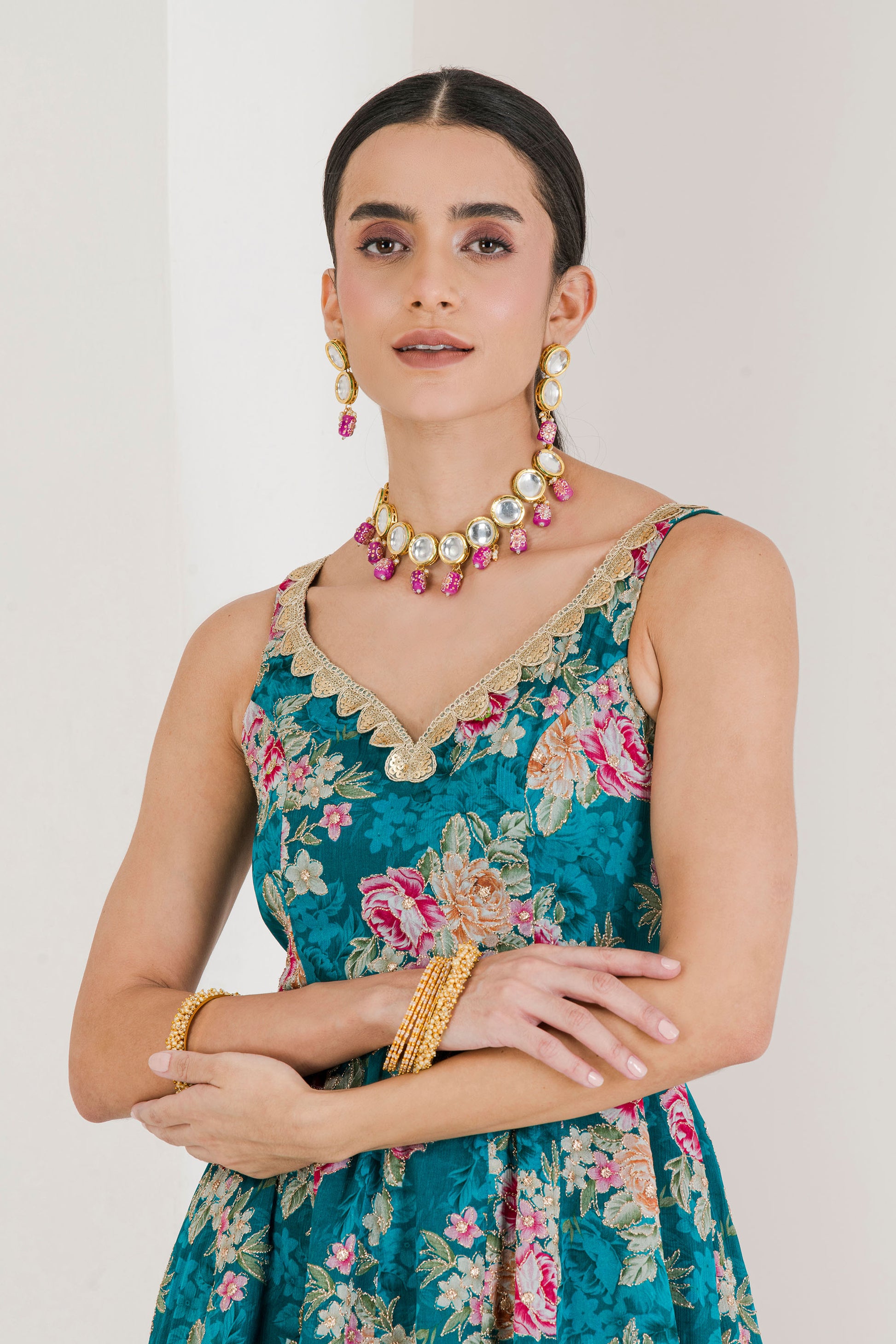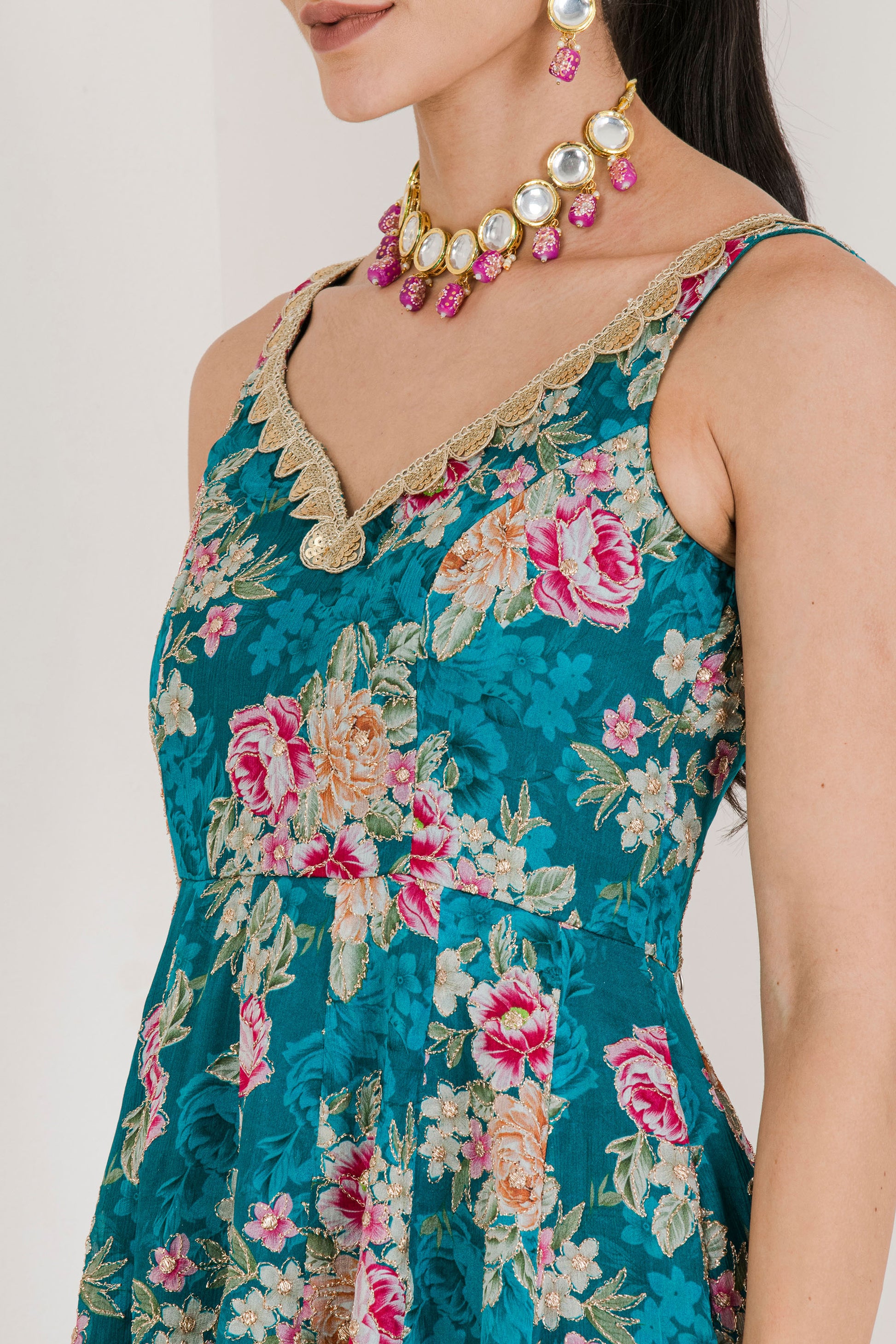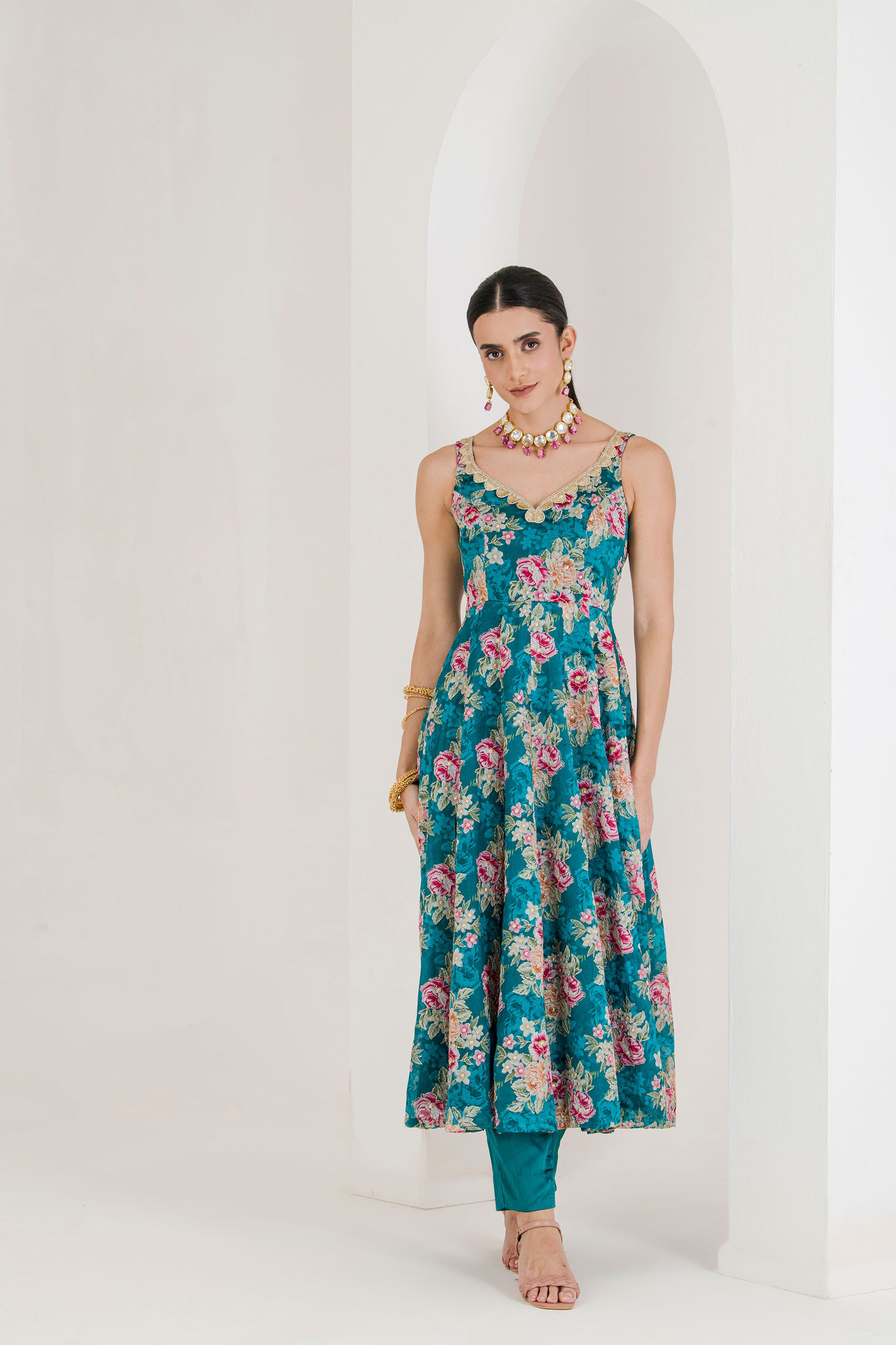 Infuse festivity into your wardrobe with our green printed anarkali set. Crafted with floral print chinnon fabric, this stunning outfit showcases position print floral embroidery with gold wire highlights. The ensemble is completed with a sheer organza dupatta and cotton pants, making it the ideal choice for your festive occasions.