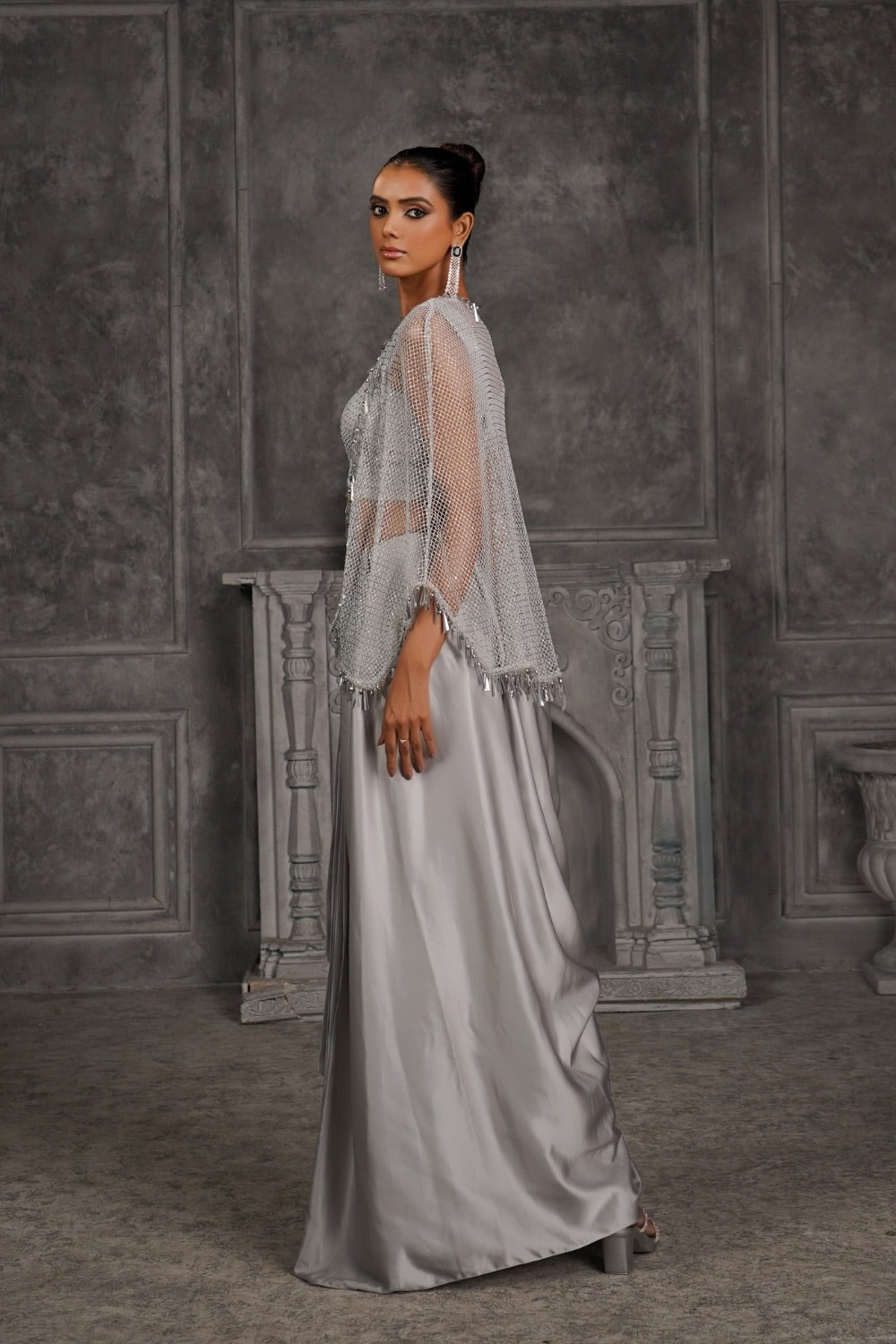 Shine bright in the pristine white soft silk Indo Western ensemble. A beautiful cropped top and jacket pair perfectly with a maxi skirt, featuring a slit. The entire outfit is adorned with heavy sequin work.