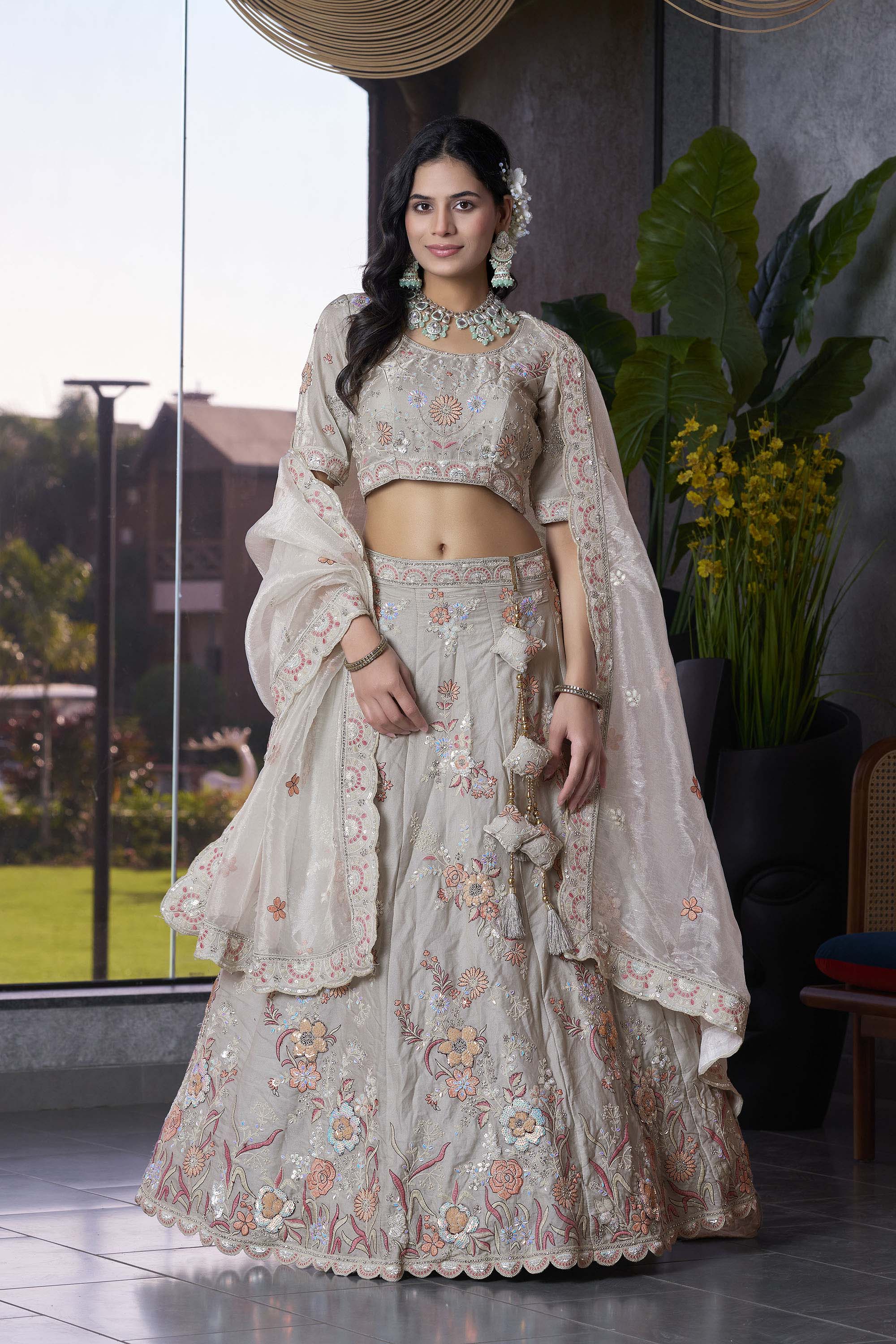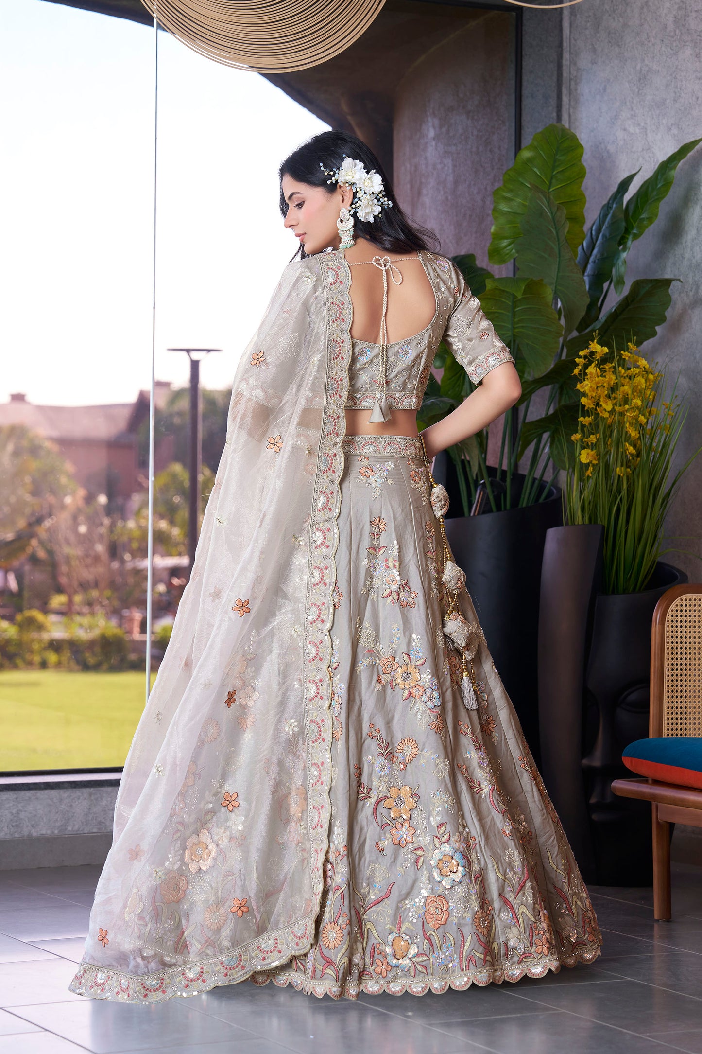 Grey Zarkan Embroidery Fendi Silk Mehendi Lehenga