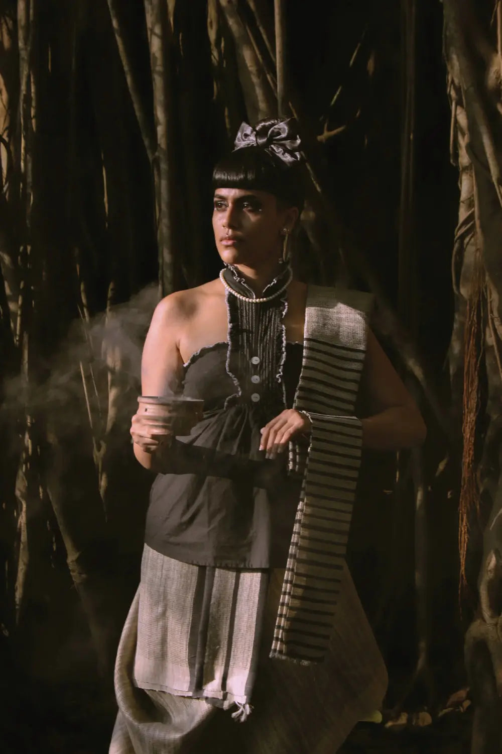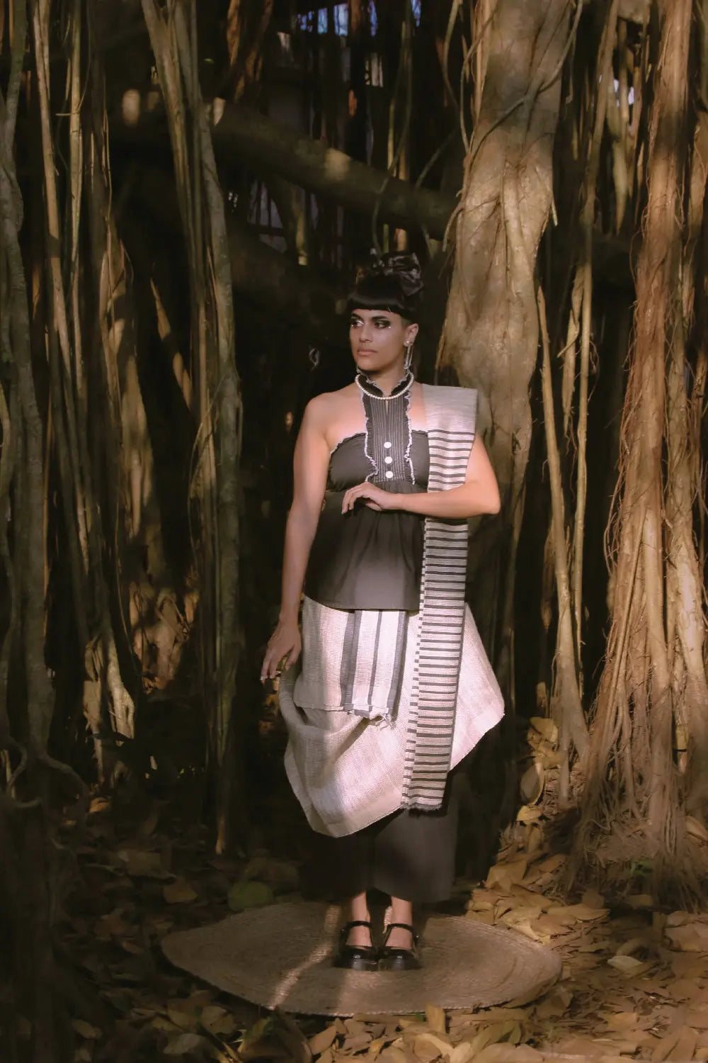 Explore elegance with our Handloom Beige Kosa Silk Saree, featuring tasteful Black stripes woven into its fabric and a contrasting Black pallu for a bold statement. Embrace a distinctive draping style, mirroring the provided picture, for a modern, avant-garde look that transforms traditional saree aesthetics. The sumptuous beige Kosa silk adds an element of sophistication, creating a harmonious fusion of timeless craftsmanship and contemporary allure. Elevate your attire with this exclusive piece, seamlessly blending the essence of tradition with a modern edge, offering a unique and captivating saree style like never before.
